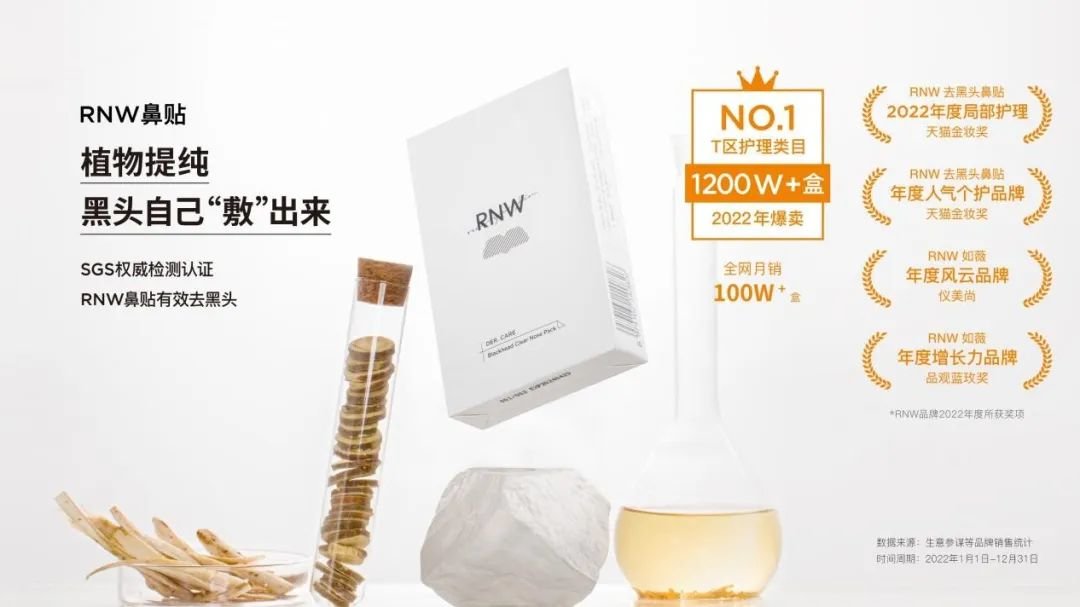 其中,由RNW如薇、UNNY悠宜等品牌推出的多款爆款产品好评率平均在95%以上。比如,RNW如薇的明星单品“双重净润去黑头鼻贴组合”,通过纳米脂质体包裹植物精粹,结合特殊生物纤维膜布,达到温和、靶向导出黑头的效果。该产品在用户群体中享有优良的口碑,并多次占据天猫细分类目的销量和人气榜首。