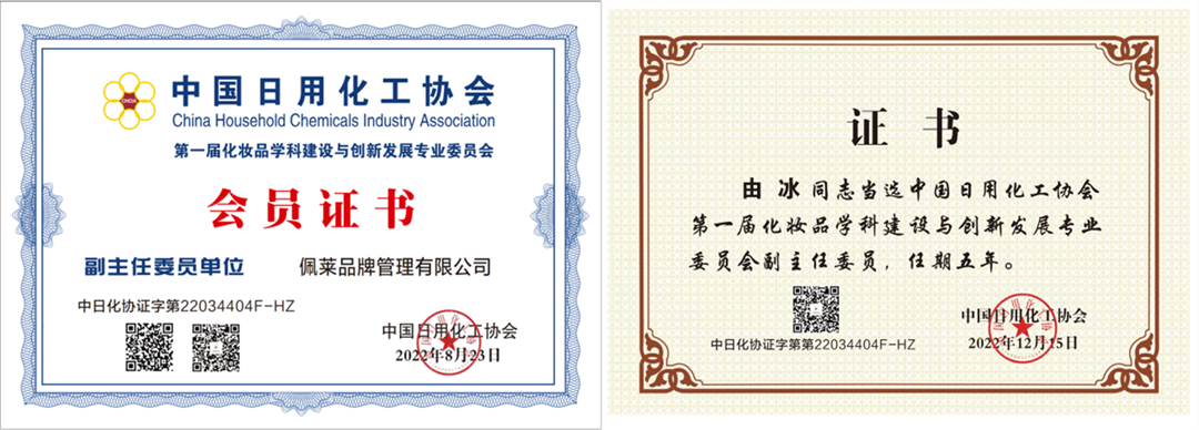 此外,自去年起,佩莱集团一直在加强对外合作。2022年8月,佩莱集团申请加入中国日用化工协会化妆品学科建设与创新发展专业委员会,并经专委会批准成为副主任委员单位,佩莱集团副总裁由冰当选专委会副主任委员。