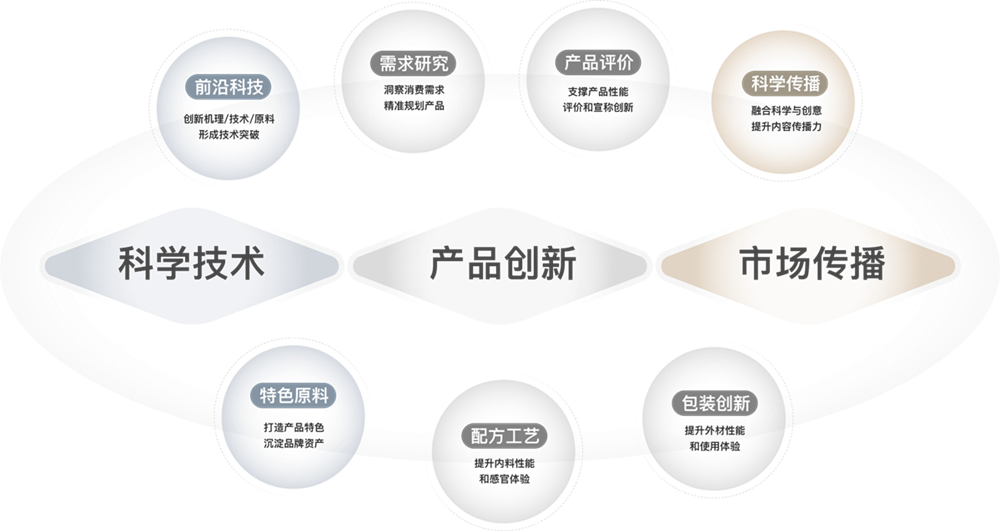 因此,佩莱集团基于外部市场环境及用户洞察,以产品力为企业第一核心力量,不断重新理解“研发”工作,从需求研究、前沿科技、特色原料、配方工艺、产品评价、包装创新、科学传播7大维度出发,赋能品牌的市场传播竞争力。