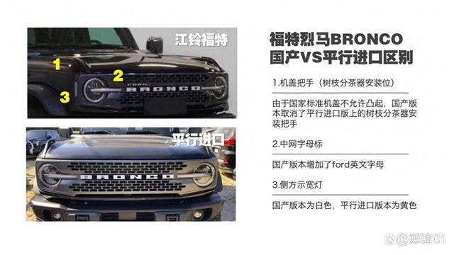 前脸还有不同点在于进口版烈马中网上面为BRONCO纯英文标志,国产版为FORD BRONCO。而且美规侧方灯必须是黄色,国产是白色,这也是两国法律的不同,带来的差异。
