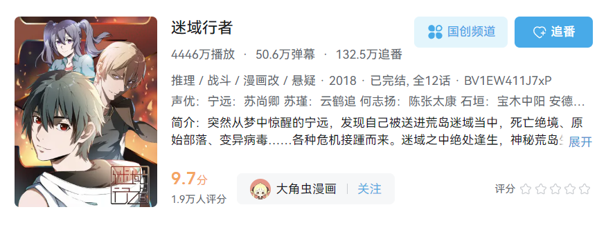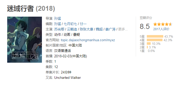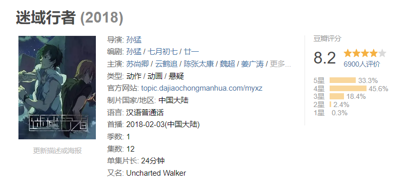 但《迷域行者》却很奇怪。据其粉丝说这部动画在2018年刚播出时,人气很高。然而本花习惯性点开豆瓣后,发现打分人数才6900人。