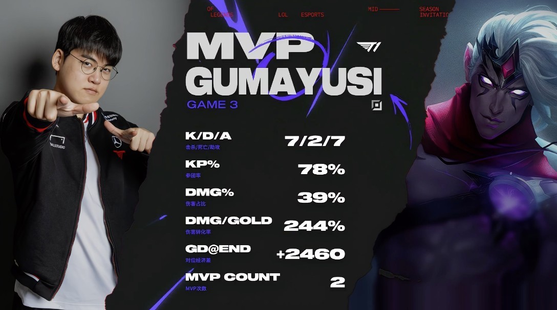 第三局游戏中,前期Knight的狐狸不停寻找机会,帮助BLG稳定住前期局面,一度获得一些小优势。关键点出现在第27分钟的大龙团,BLG决策犹豫,T1拿下大龙后又打出0换4的团战,就此奠定领先。后期T1蝎子与牛头的两座“城墙”让BLG无法开团,最终遭到T1横扫。第三局的MVP给到伤害爆炸的下路Gumayusi。