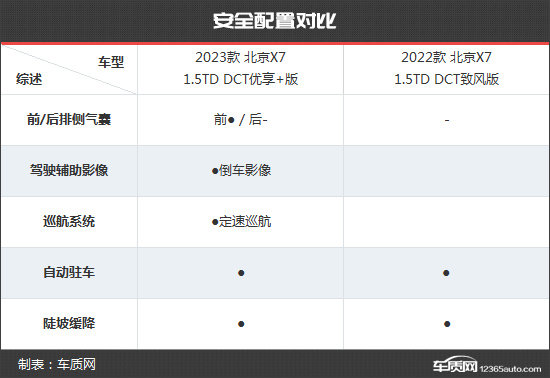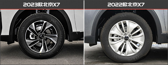 在安全配置上,新老款车型基础配置都很全面,例如主/副驾驶座安全气囊、胎压显示、后驻车雷达均有配备。同时2023款北京X7也进行了升级,与老款车型相比增加了前排侧气囊、倒车影像以及定速巡航功能。