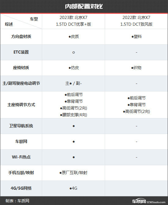 2023款北京X7搭载了最新的车机系统,功能上也比老款车型多出了卫星导航系统、车联网、Wi-Fi热点等功能,进一步满足了消费者日常用车需求。在其它方面,车辆方向盘由此前的塑料材质升级为皮质,主驾驶座椅不仅多出了电动调节功能,同时还多出了腰部支撑功能,舒适性更胜一筹。此外,2023款北京X7全系配备了空调控制屏,而老款入门车型则不具备。