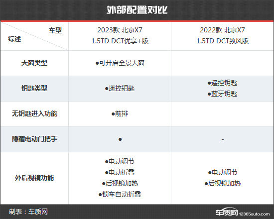 总结:通过对比来看,2023款北京X7的外观设计更为出色,通过针对前、后车灯、前格栅以及尾部的重新刻画,运动以及科幻气息相比老款车型更胜一筹。此外,新款车型通过对中控台布局以及方向盘样式的重新设计,提升了内饰整体的高级感。同时在配置层面还新增了一些老款车型所不具备的功能,结合11.99万元的起售价,2023款北京X7未来的市场表现值得期待。