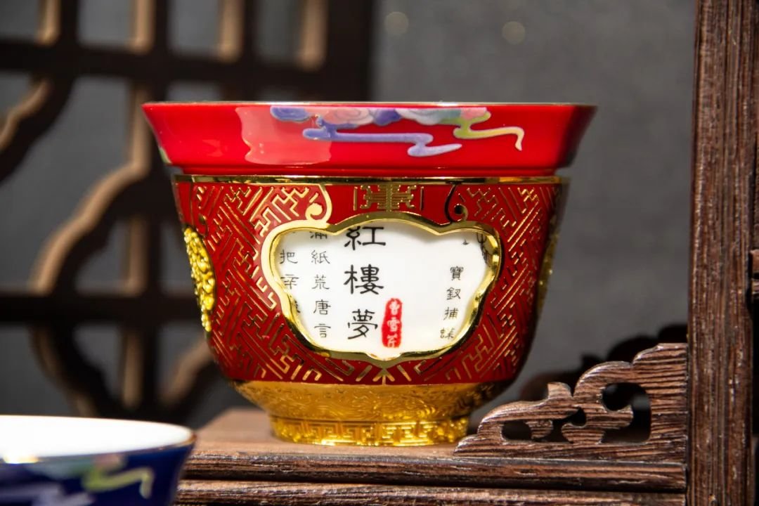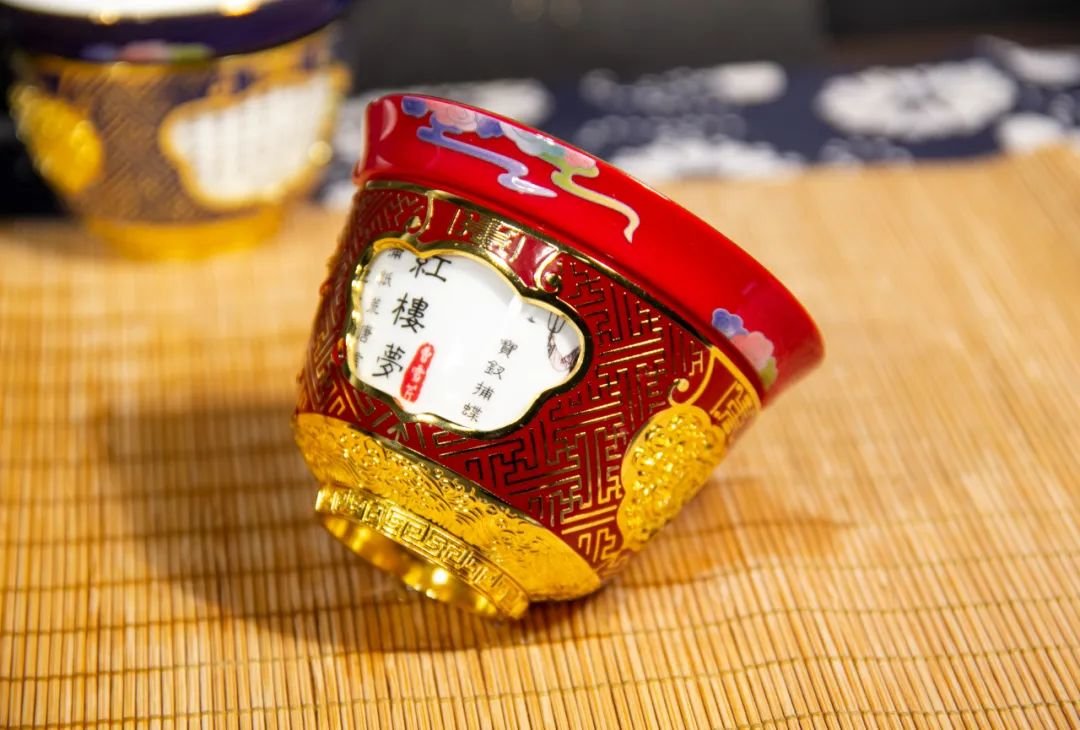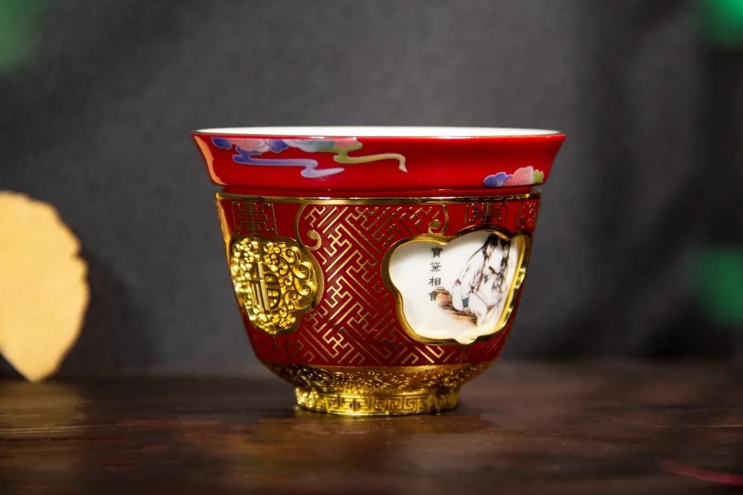 这只《红楼梦》转心杯,整体色调为故宫红,平和热烈,金色的吉祥纹饰装点其上,华贵而庄重。