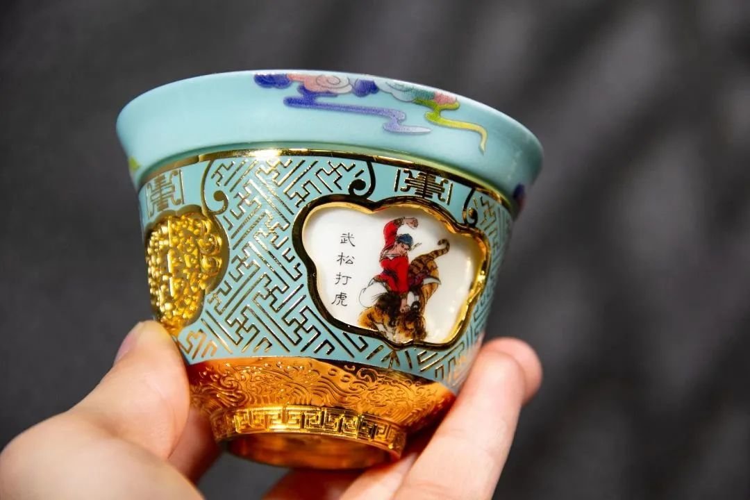 内杯外壁绘有四幅经典情节图案:智取生辰纲、倒拔垂杨柳、风雪山神庙和武松打虎。