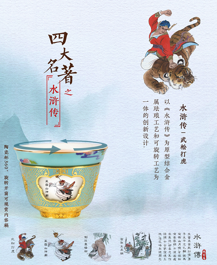 它在镂空的外杯内置轴承,再组合一个可以360°任意转动的内杯,绘上四大名著主题插画。