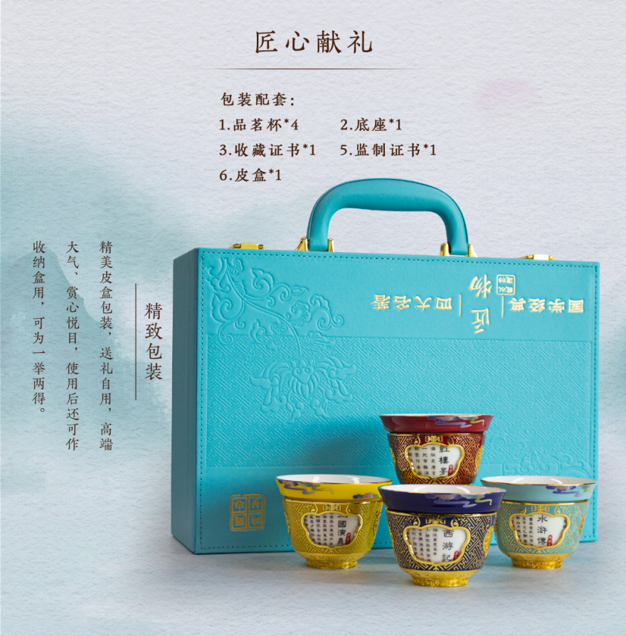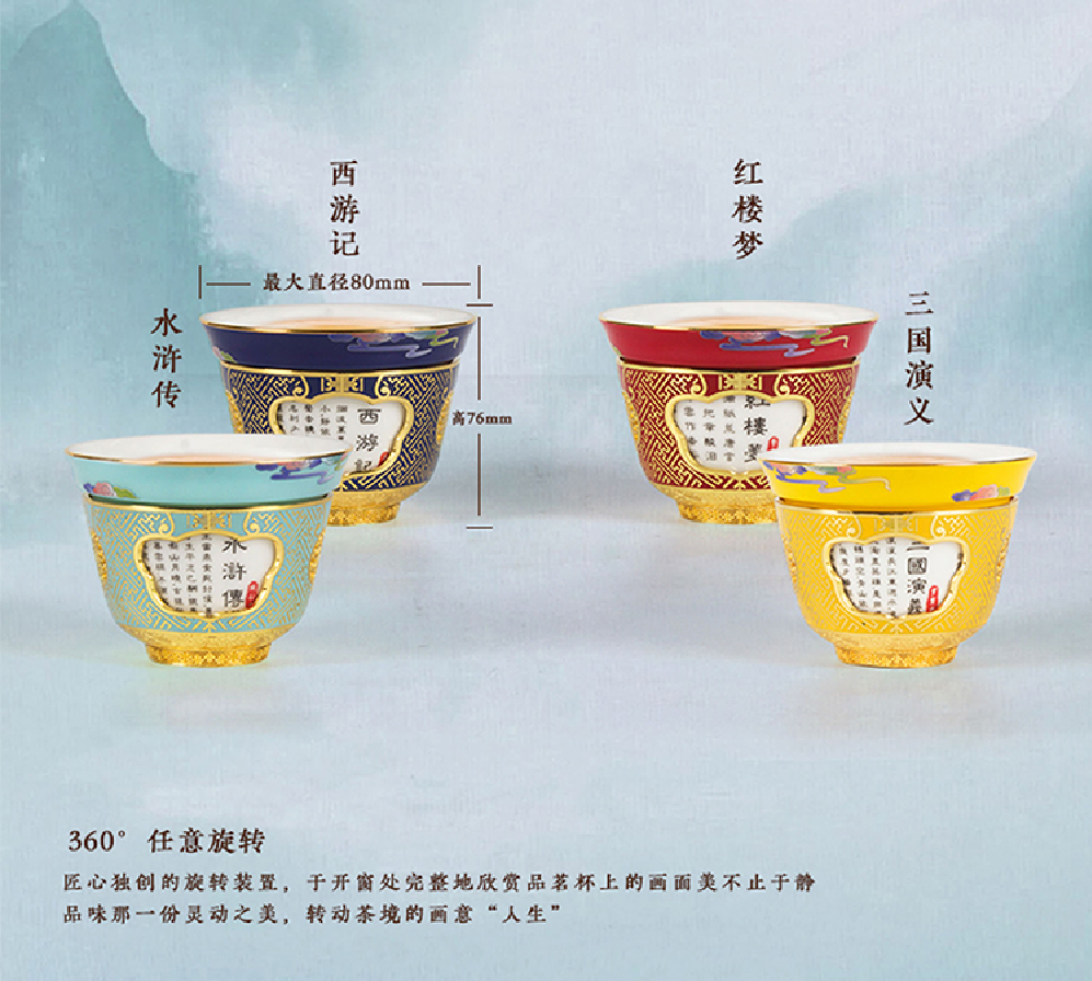 四只《四大名著》转心杯,分别以故宫红、帝王黄、西湖蓝和霁蓝为主色,四种传统色彩对应四大名著不同主题,带你品位传奇经典,演绎艺术生活。