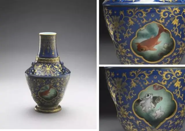 ▲清乾隆 霁青描金游鱼粉彩转心瓶