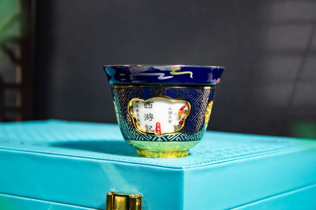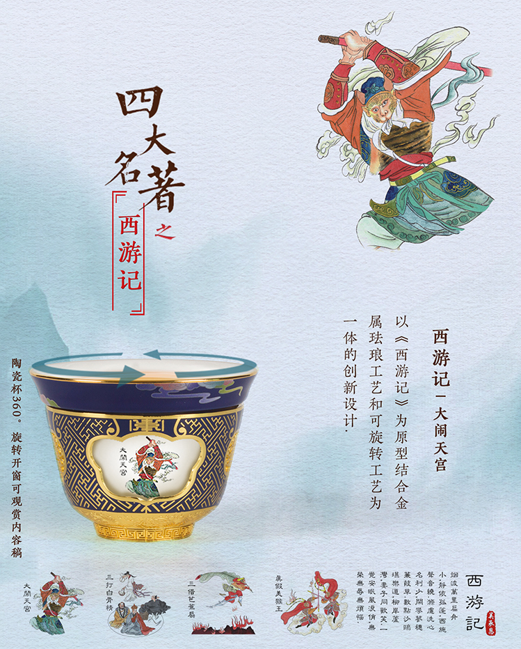 《西游记》主题转心杯,在色彩上选用了沉稳的霁蓝色,如深海一般的纯正蓝色,缥缈而深远,别具魅力。