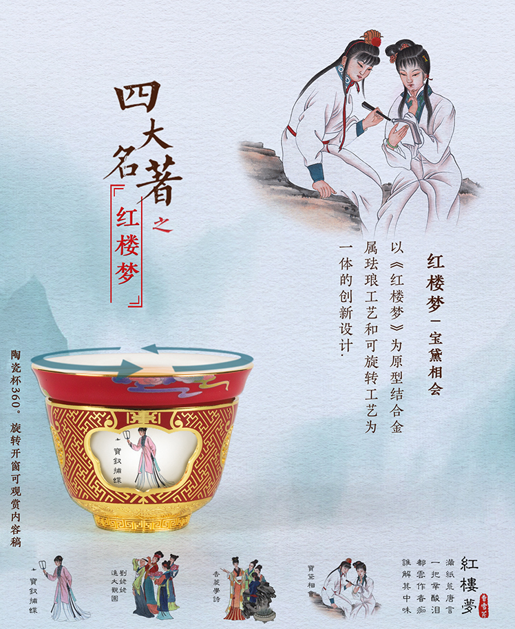 内杯上绘有宝黛相会、香菱学诗、刘姥姥逛大观园和宝钗扑蝶,四幅原著中的经典插画,将红楼人物形象刻画得栩栩如生。