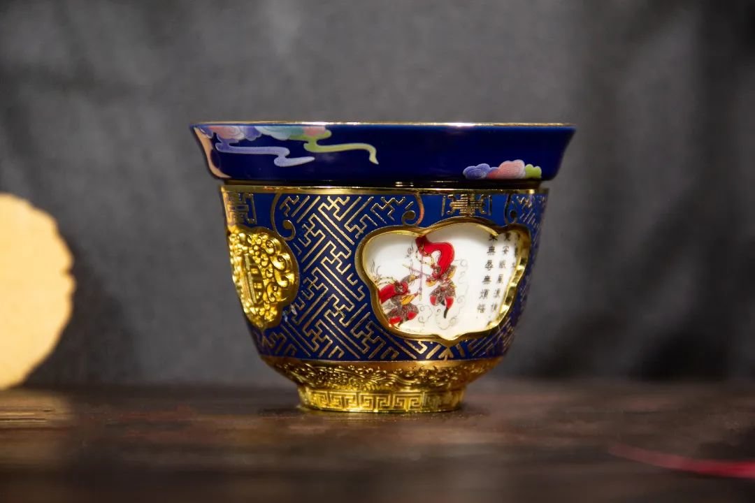 外杯采用金属珐琅和陶瓷珐琅创意结合工艺,承自“燕京八绝”之一——景泰蓝。