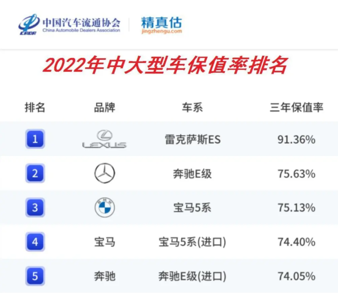 另外,在日系车消费者最在意的二手车保值率方面,雷克萨斯ES200和亚洲龙双擎都有着不错的表现。前者的三年保值率高达91.36%,位居2022年中大型车保值率之首。后者三年保值率虽然没有雷克萨斯ES那么离谱,但也达到了71.26%,属于保值率较高的车型。