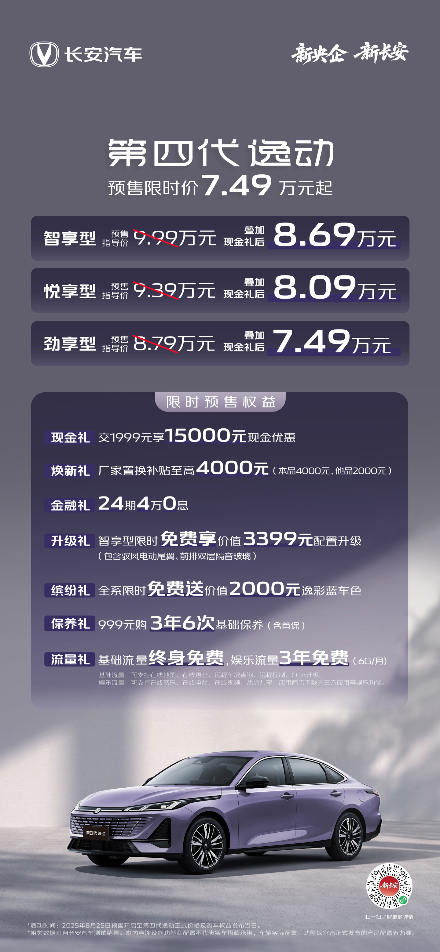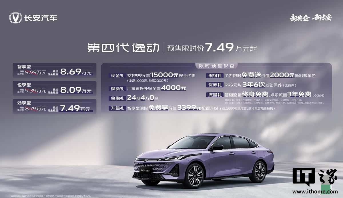 IT之家 8 月 25 日消息,长安汽车 2026 款逸动(官方称“第四代”)燃油版已开启预售,共推出劲享型、悦享型、智享型三款车型,预售价区间为 8.79 万至 9.99 万。在叠加现金礼后,预售限时价为 7.49 万至 8.69 万。官方还为消费者提供了多项购车权益,包括交 1999 元享 15000 元现金优惠;厂家置换补贴最高 4000 元(本品 4000 元 / 他品 2000 元);24 期 4 万 0 息贷款;智享型限时免费升级价值 3399 元的配置(包括驭风电动扰流板和前排双层隔音玻璃);全系限时免费赠送价值 2000 元的逸彩蓝车色;999 元购买 3 年 6 次基础保养(含首保);基础流量终身免费,娱乐流量 3 年免费(6G / 月)。