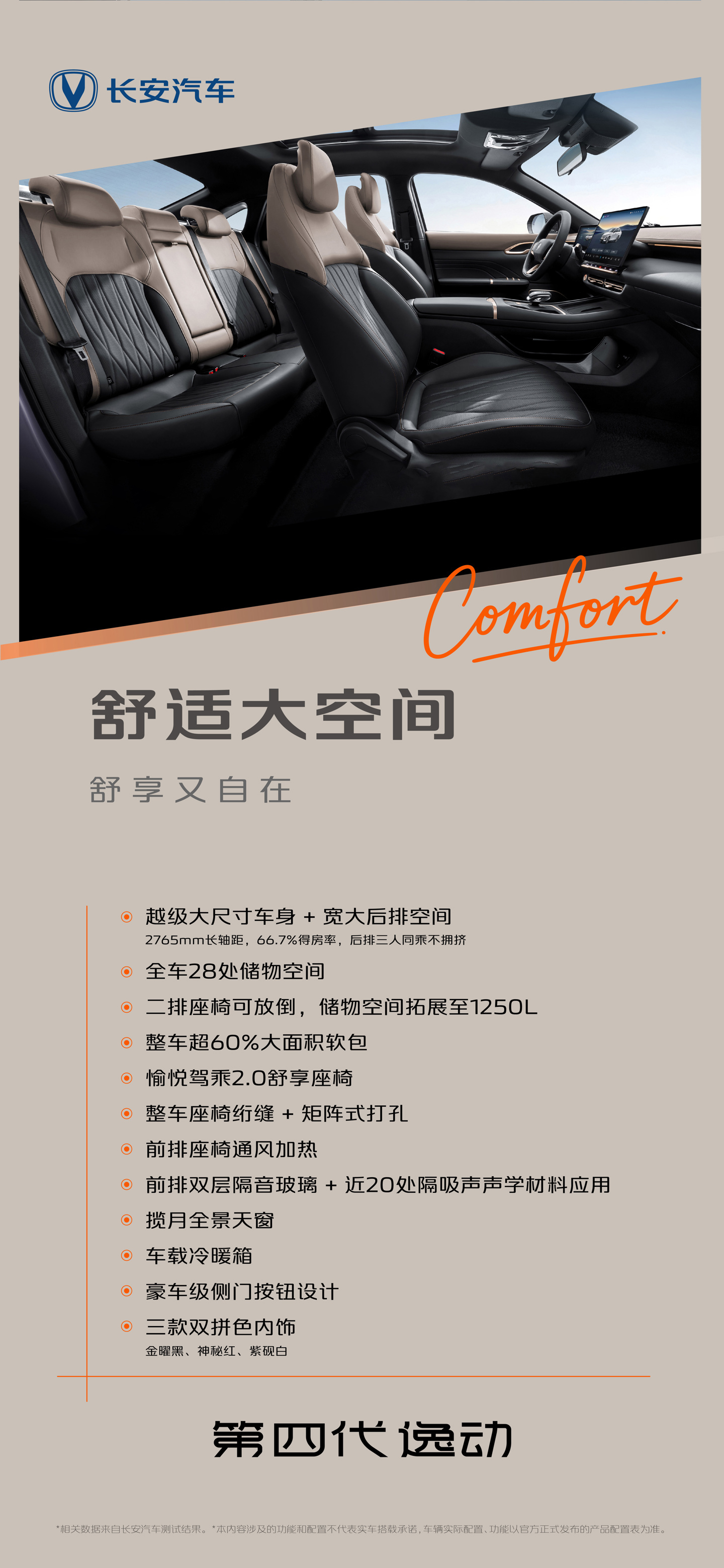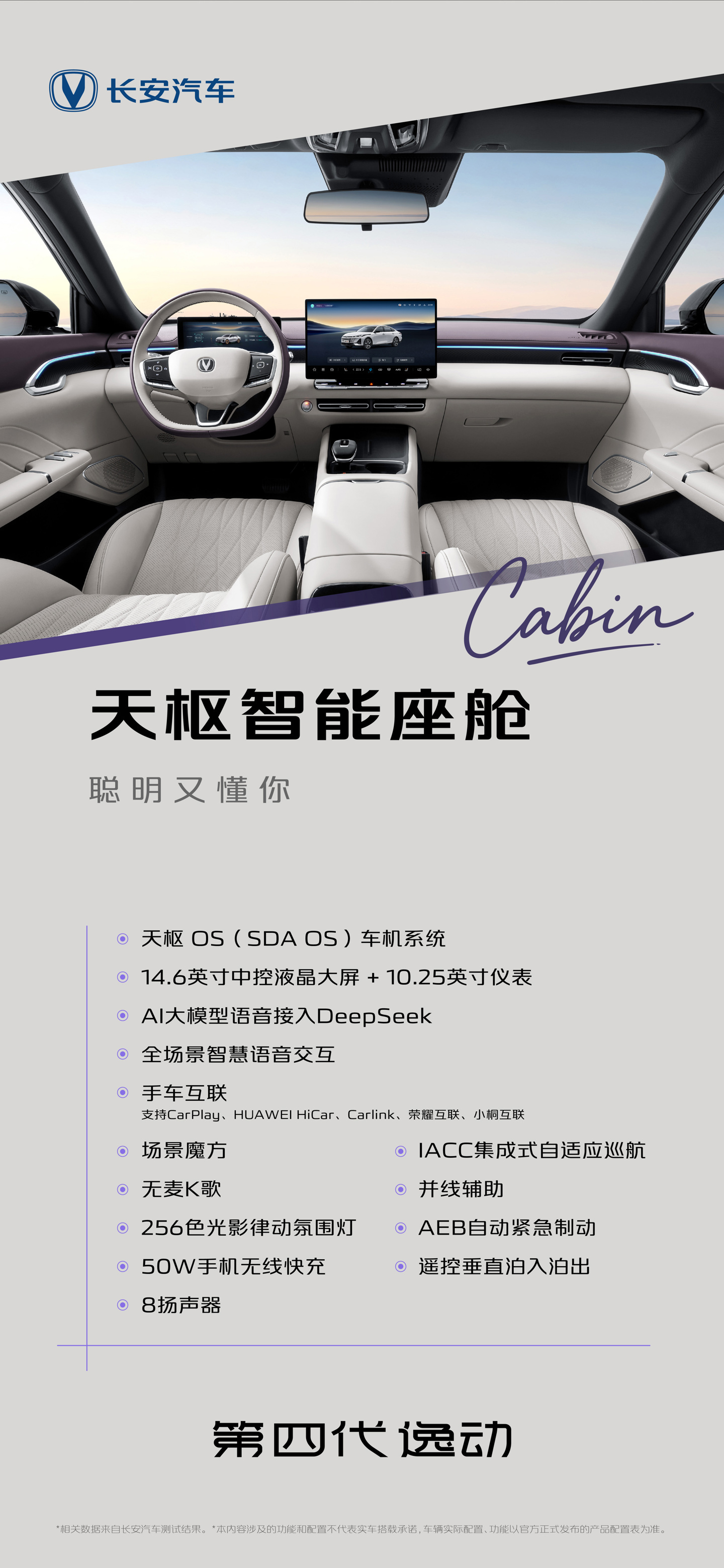 驾驶辅助功能方面,新款长安逸动配备有 IACC 集成式自适应巡航、后追尾预警 RCW、倒车横向预警 RCTA、盲区监测 BSD、并线辅助 LCA、开门预警 SEW、LDW 车道偏离预警、LKA 车道保持辅助、TSR 交通标志识别、HMA 智能远光灯、遥控垂直泊入泊出等功能,预计上述功能仅在高配车型提供。其他配置方面,新款长安逸动还将配备 50 瓦风冷手机无线充电、外后视镜电动调节、前排座椅通风 / 加热、主驾座椅电动调节、全景天窗、屏幕换挡、8 扬声器音响系统、256 色氛围灯、无麦 K 歌等配置。