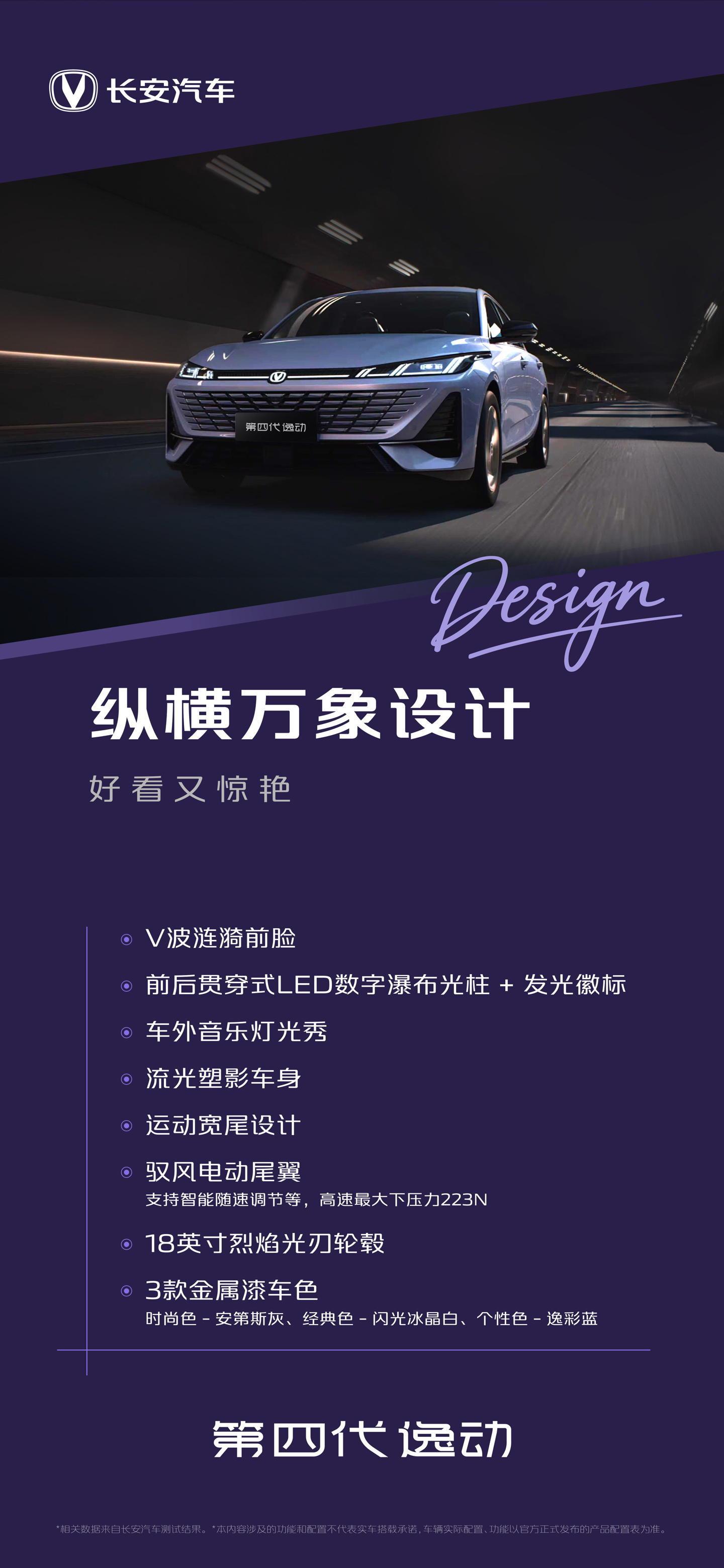 IT之家注意到,在外观设计上,2026 款逸动采用了纵横万象设计风格,封闭式前格栅内部加入点阵式元素,搭配星环式灯带,视觉层次感十足。全系标配前后贯穿式 LED 数字瀑布光柱与发光徽标,驻车时可联动网易云音乐,开启车外灯光秀。车身颜色提供逸彩蓝、安第斯灰以及闪光冰晶白三种选择。配置方面,根据不同车型,提供电动可升降后扰流板、18 英寸轮圈等。