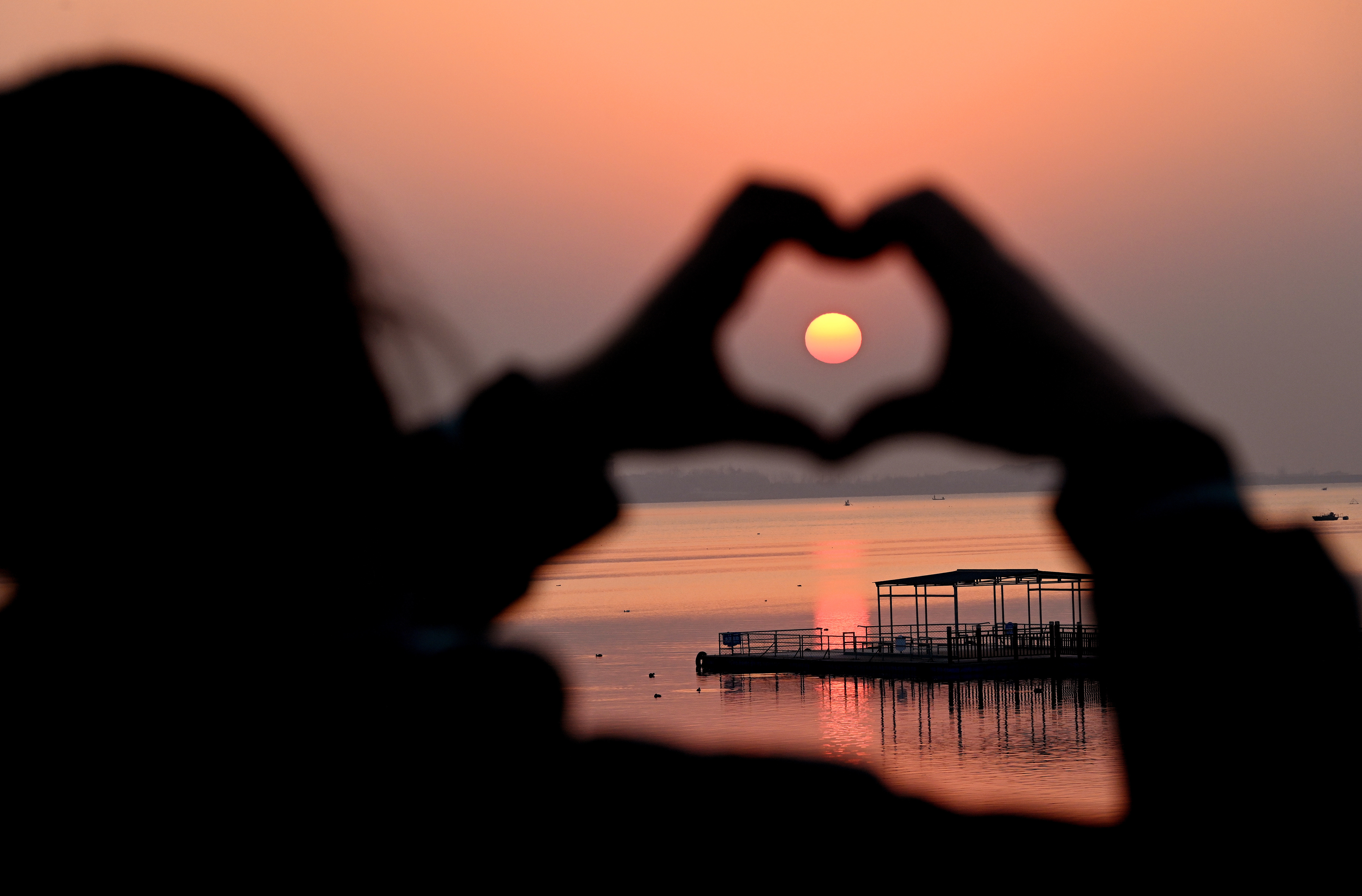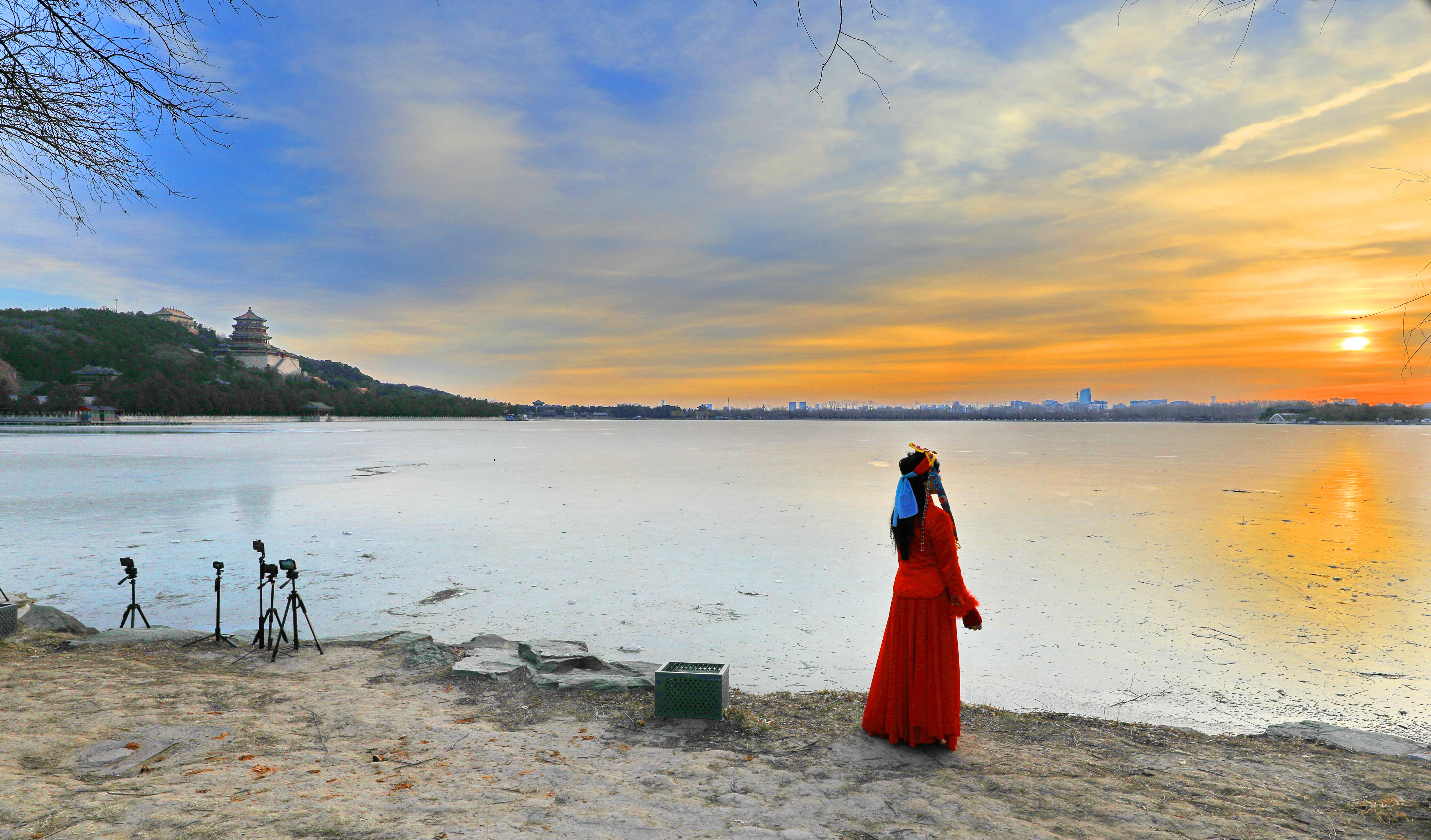 ↑2025年1月1日,游客在北京市颐和园昆明湖畔与朝霞合影留念。CICPHOTO/刘宪国 摄