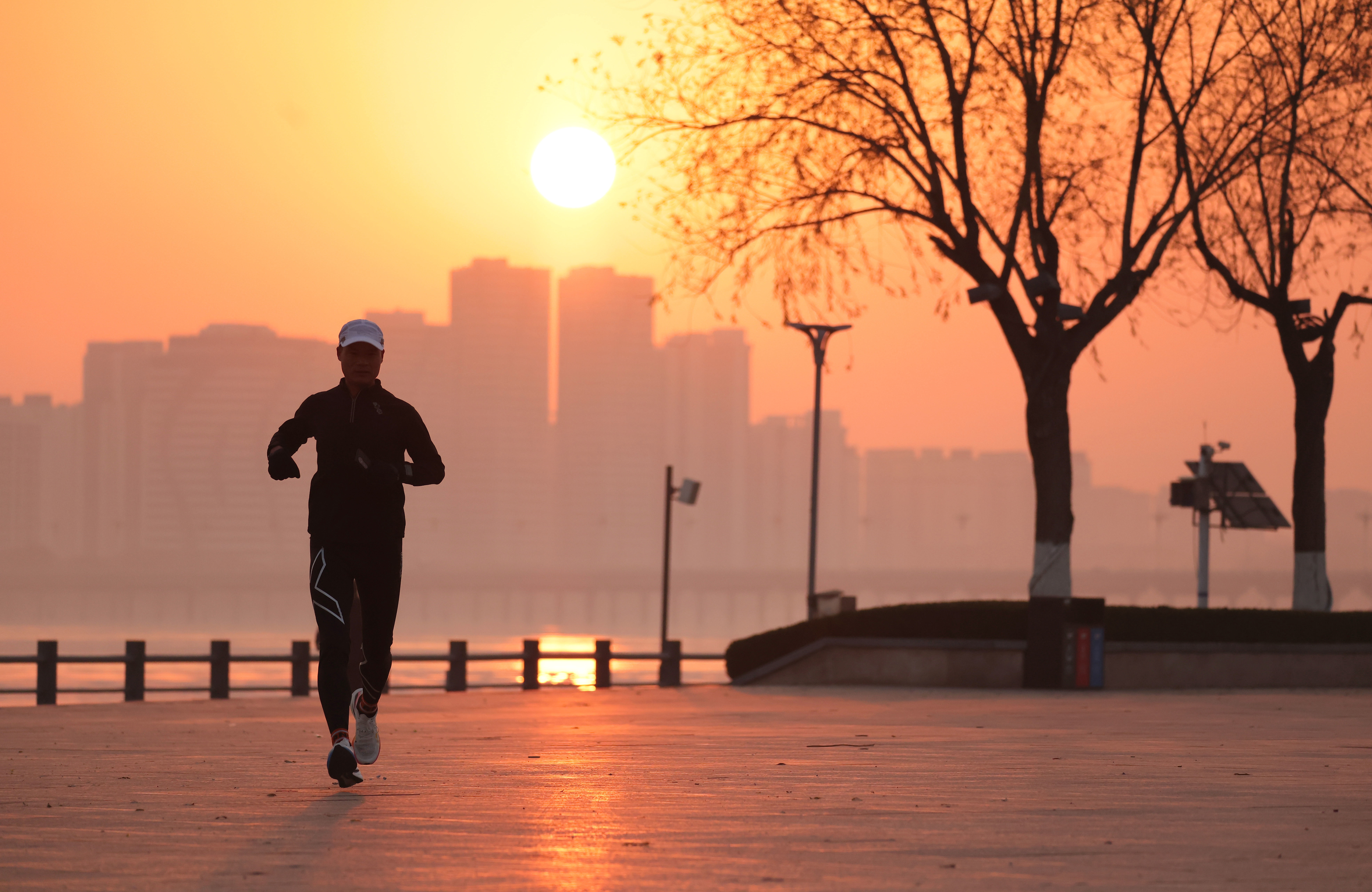 ↑2025年1月1日,市民在山东省临沂市兰山区沂河西岸晨跑。CICPHOTO/许传宝 摄