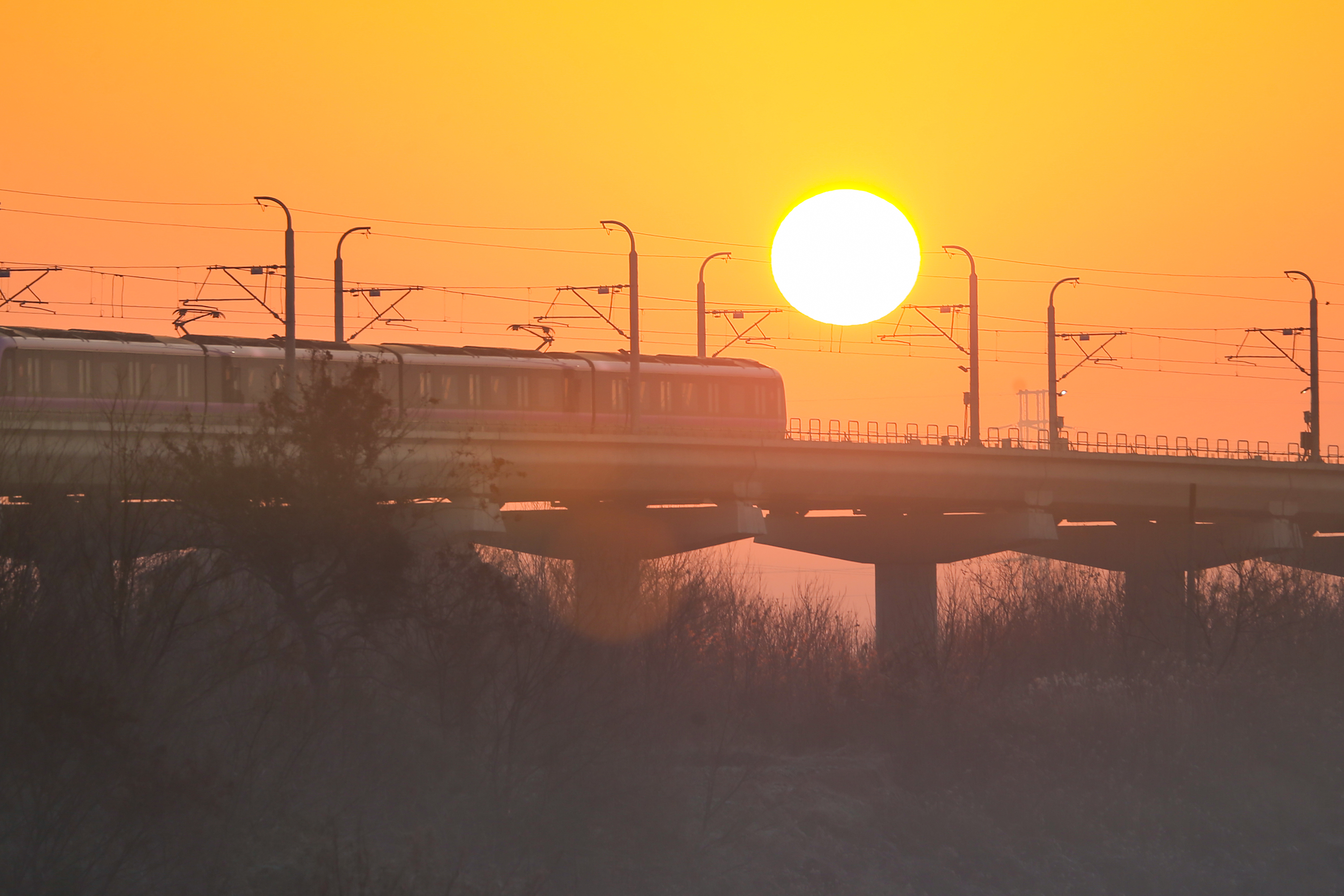 ↑2025年1月1日,一列宁句城际列车伴随着新年晨光从江苏省句容市黄梅段驶过。CICPHOTO/钟学满 摄