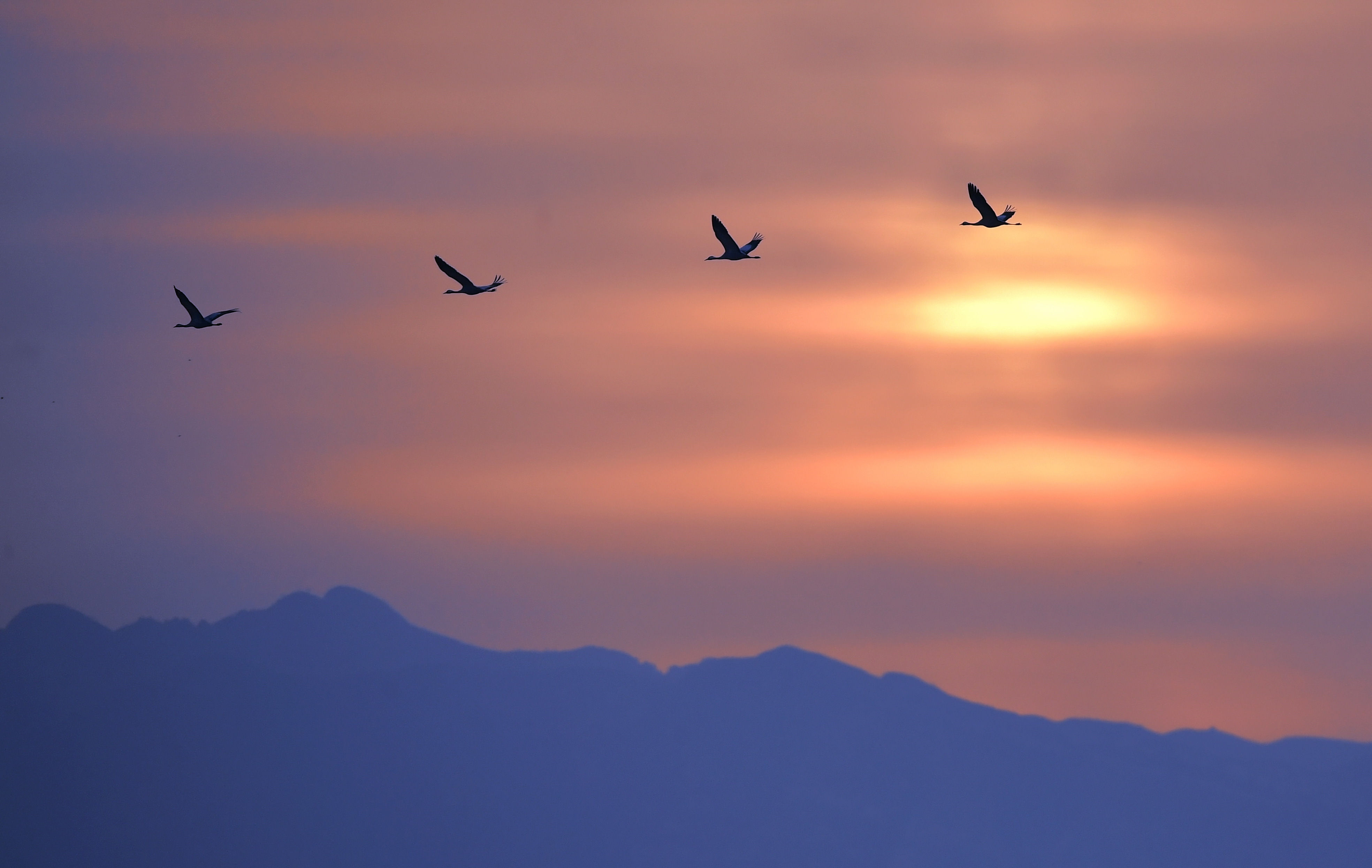 ↑2025年1月1日,一群灰鹤在河北省张家口市怀来县官厅水库国家湿地公园迎着朝霞展翅飞舞。CICPHOTO/孙慧军 摄