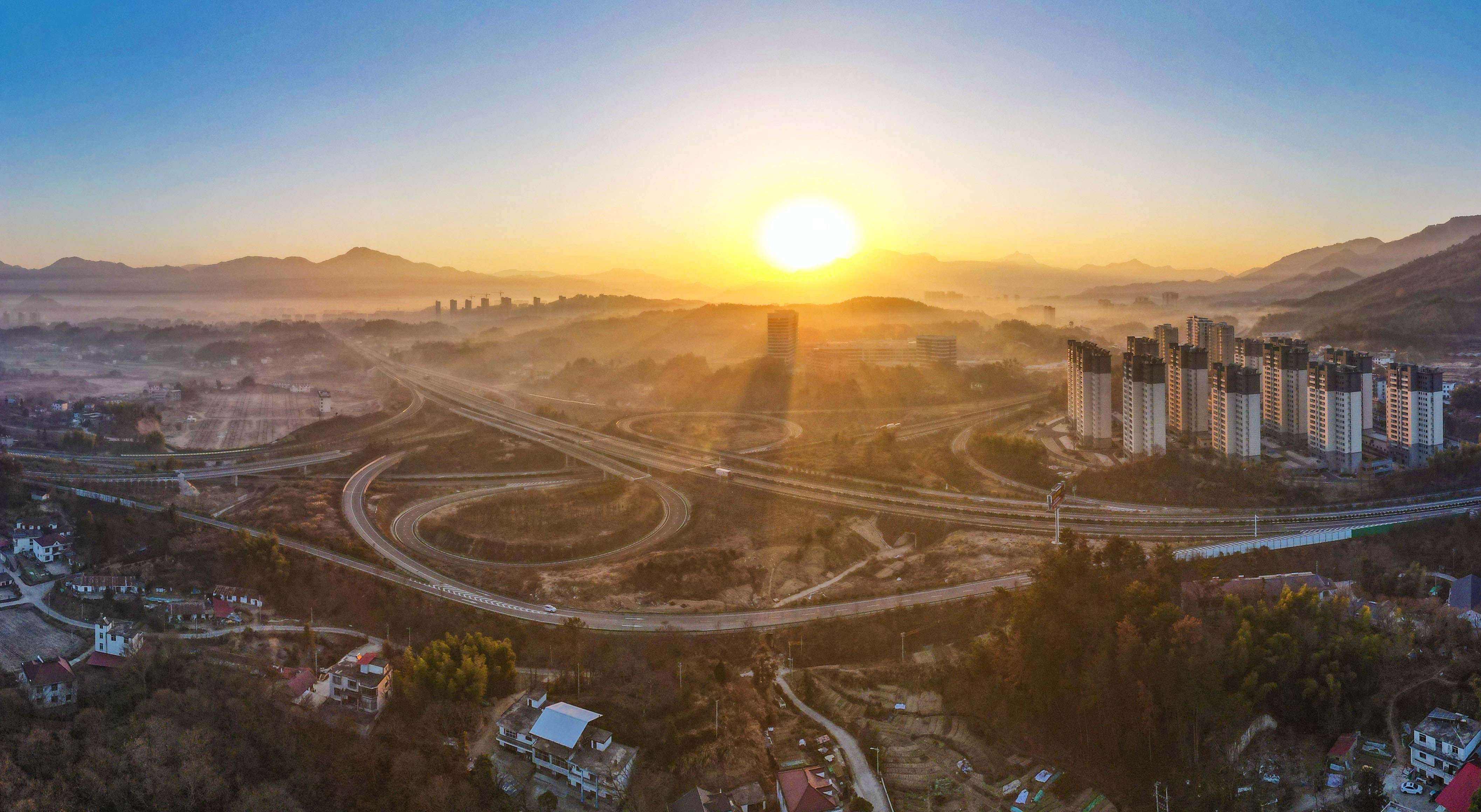 ↑2025年1月1日,车辆伴随着晨光行驶在安徽省安庆市岳西县莲云乡境内的济广高速、沪武高速公路上。(无人机照片)CICPHOTO/吴均奇 摄