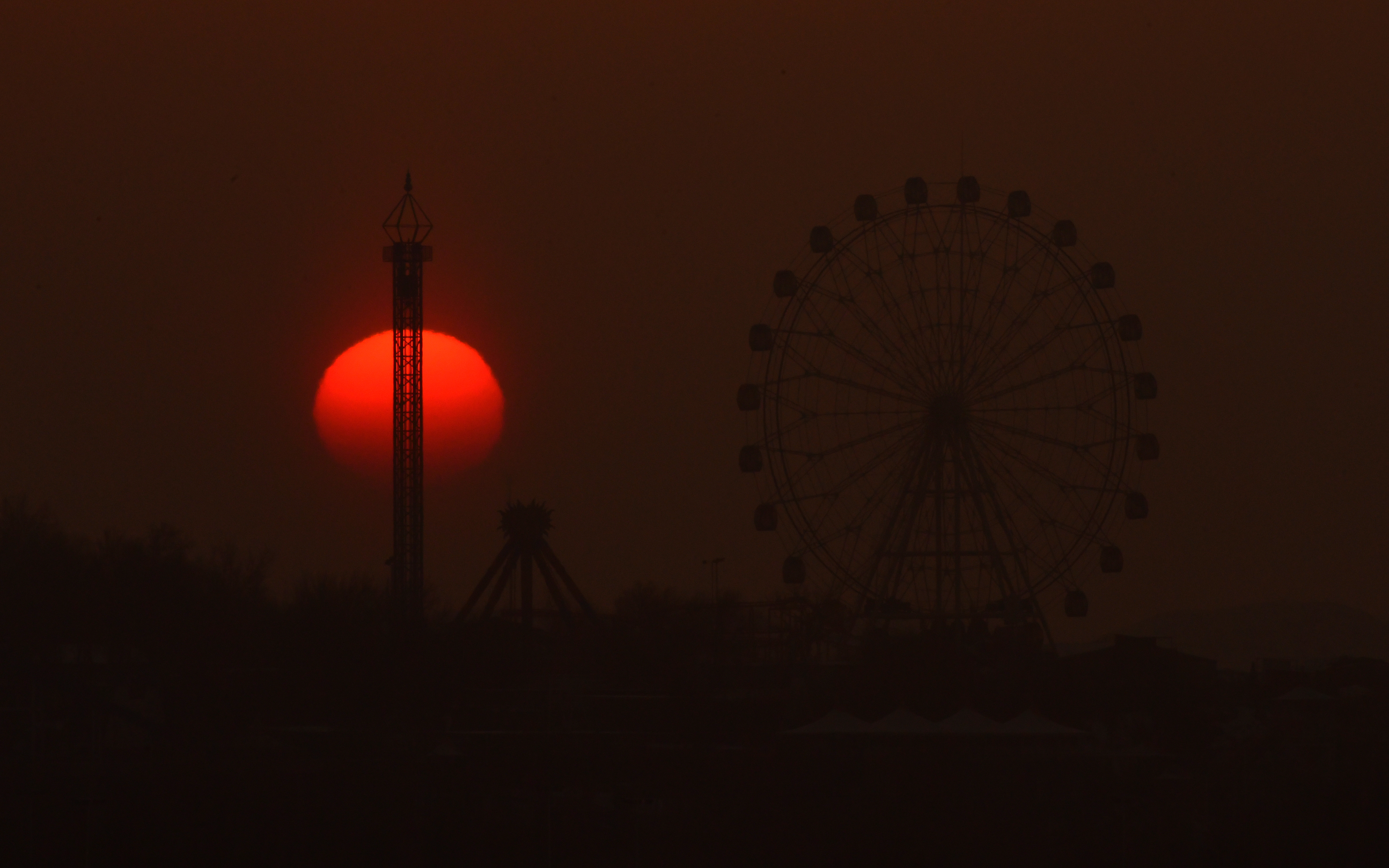 ↑2025年1月1日,一轮红日从新疆巴音郭楞蒙古自治州库尔勒市龙山公园缓缓升起。CICPHOTO/确·胡热 摄