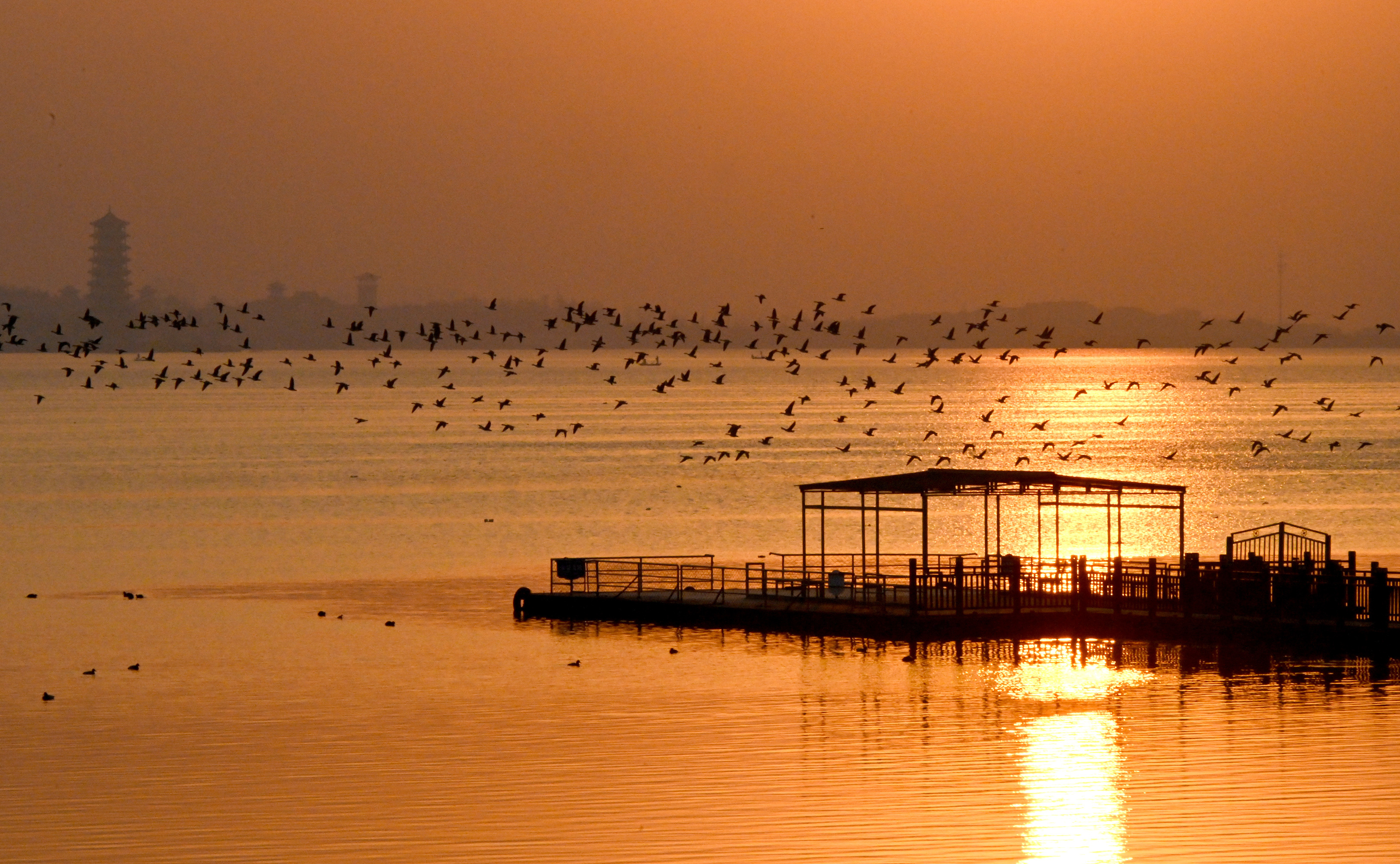 ↑2025年1月1日在江苏省泗洪县洪泽湖湿地临淮段拍摄的晨曦景观。CICPHOTO/张连华 摄