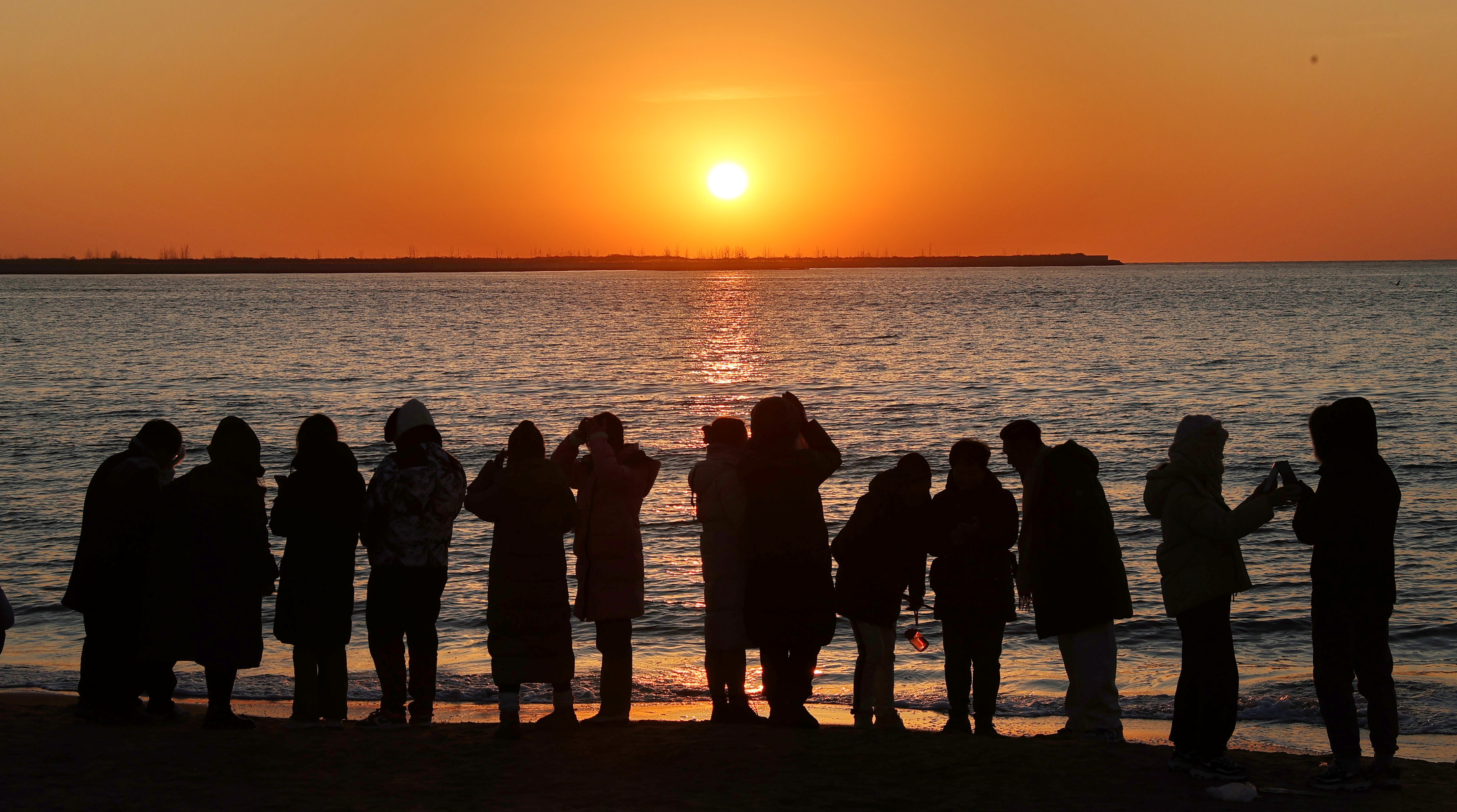 ↑2025年1月1日,市民与游客在河北省秦皇岛市海港区金梦海湾观看日出。CICPHOTO/曹建雄 摄