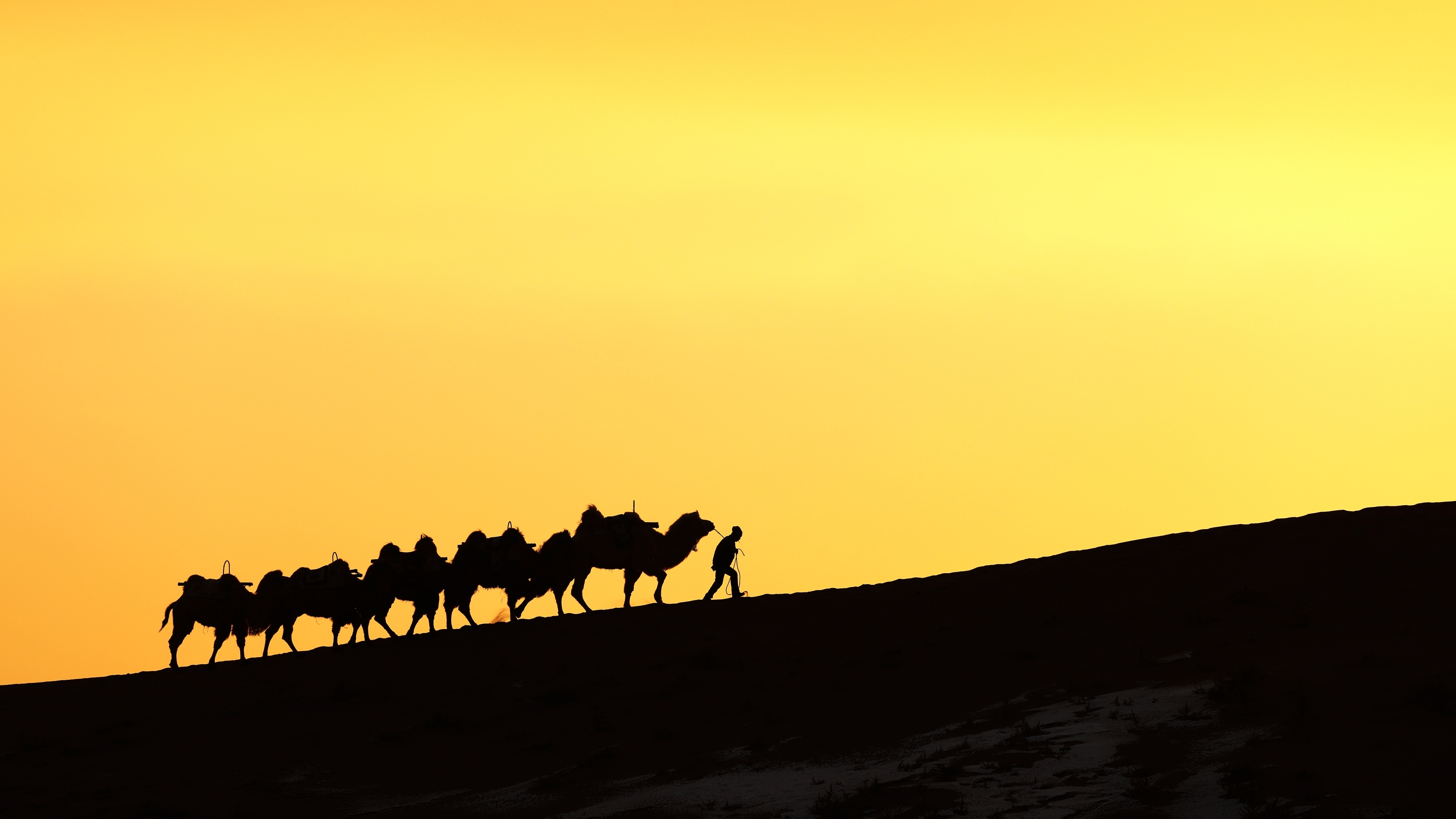 ↑2025年1月1日,一队骆驼迎着朝阳行走在甘肃省张掖市神沙窝太阳岛景区的沙漠上。CICPHOTO/成林 摄