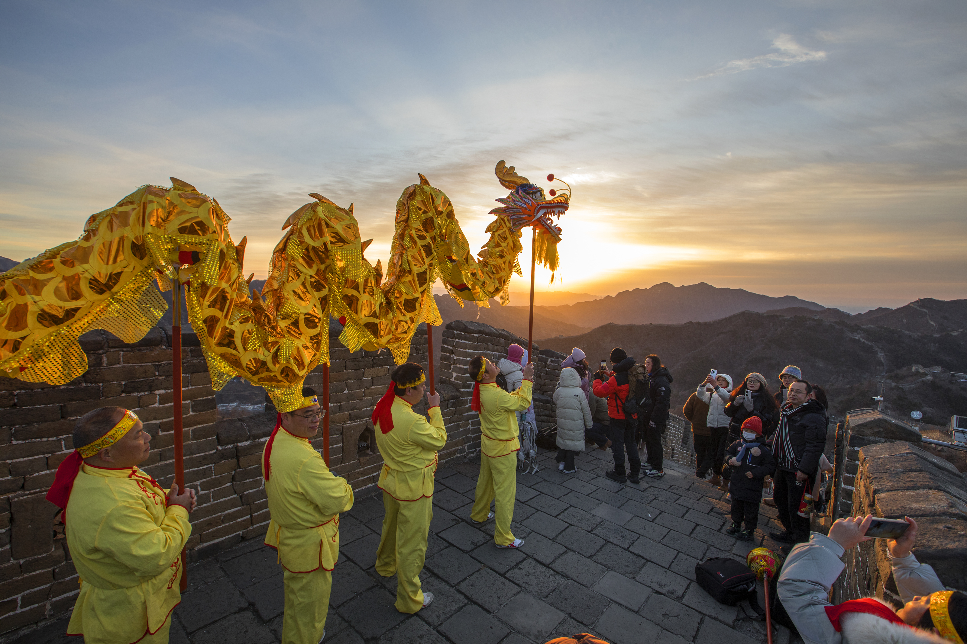 ↑2025年1月1日,游客在北京市怀柔慕田峪长城观看日出。CICPHOTO/卜向东 摄