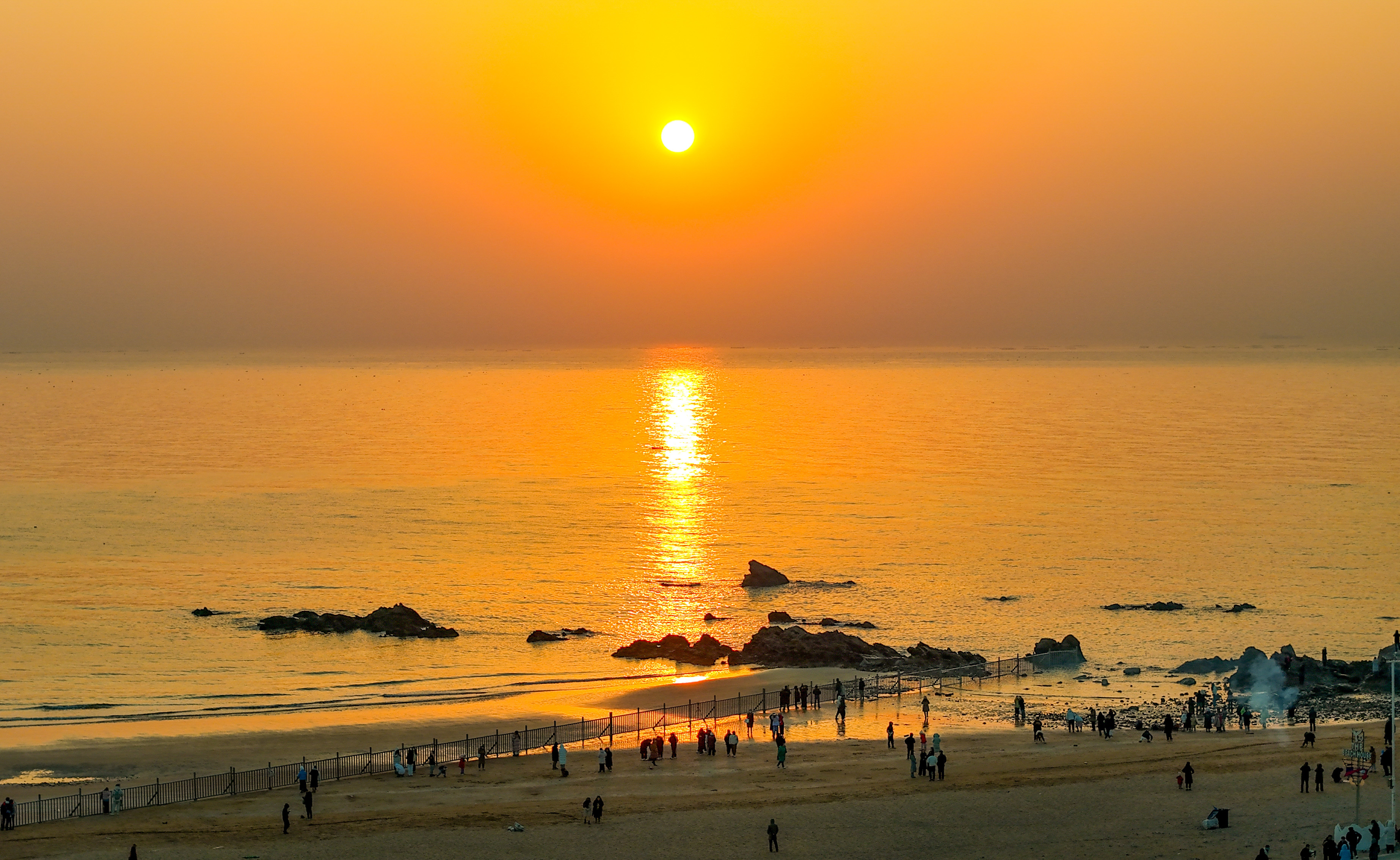 ↑2025年1月1日,市民和游客在山东省青岛市西海岸新区金沙滩迎接新年的第一缕阳光。CICPHOTO/张进刚 摄