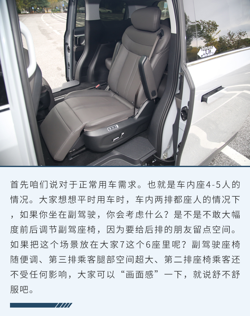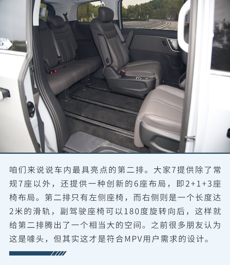 这次在试驾过程中,我也跟随车厂家小伙伴聊了半天。我问对于大家7,他们到底有没有信心。得到的答案是非常肯定的。给出的理由也确实很有说服力。首先对于大家7来讲,很多的用户都是家庭增购或者换购的,这些消费者已经有过MPV或提供三排座椅的产品使用经历,他们知道什么才是MPV用户最需要的,大家7的这些亮点,对于增换购用户绝对是非常实用也非常能打动他们的。而对于新用户来讲,大家7的每一个所谓亮点设计,都是真正基于用户使用需求而研发的,讲出去大家不会觉得虚无缥缈,没有诚意。厂家这句话,确实所言非虚。