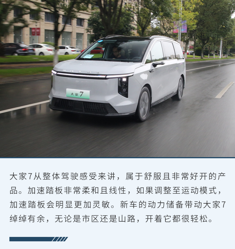 大家7的动力系统同样得到了大量上汽集团最新技术的支持。新车首先驾驶感受已经完全乘用化,而且对于MPV使用场景真正进行了针对性优化,开起来非常顺手。此外,大家7的换电版本也绝对是一大亮点,毕竟车价能减10万,最关键是上汽的换电站网络与中石油的品牌合作后,它的普及还是非常值得期待的,而且换电车辆不用断电,体验也很好,这车换电版本绝对值得考虑。