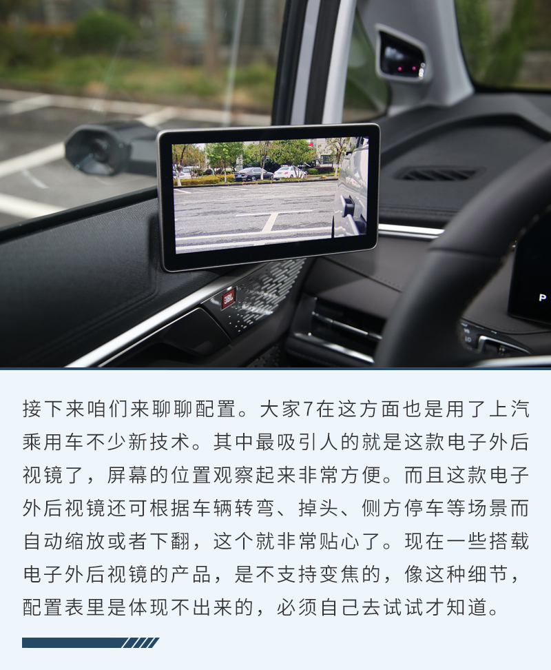 上汽大通 大家7首先整体配置还是非常丰富的,而且像电子外后视镜等功能优化要比业内很多产品要更细致,体验也更好。另外本次随行的厂商小伙伴也跟我们聊了,像电子外后视镜选装价格不过5000元,主旨是在大家可接受范围内,享受这些配置。