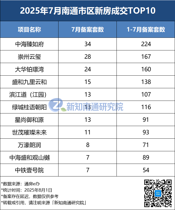 南通市区新房成交数据报告(2025年7月)