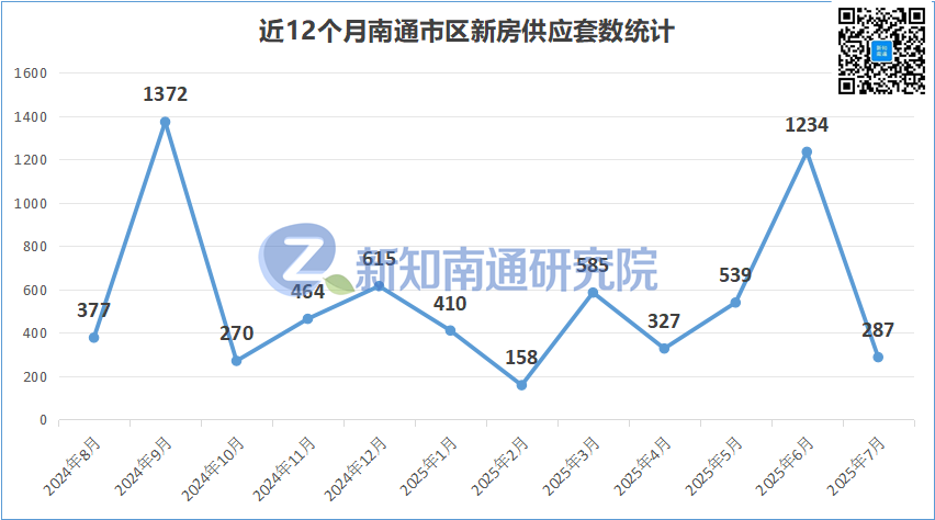 据「新知南通研究院」不完全统计,2025年7月,南通市区(含崇川区、开发区、苏锡通园区)仅虹桥板块锦鸿府一个项目领取两张住宅销售许可证,新增入市房源287套,供应量环比暴跌约77%,同比亦下跌约30%。