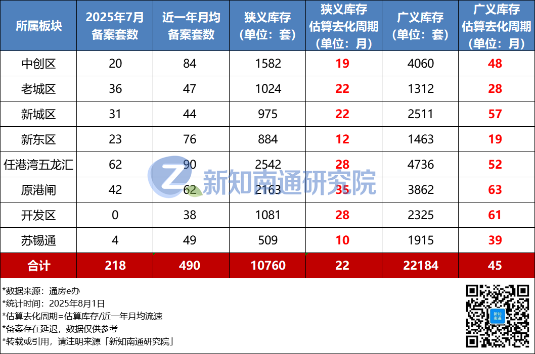 截至7月末,南通市区新房狭义库存(已获销许未备案)约1.08万套,按照近一年月均流速(约490套)估算,去化周期约21.96个月。
