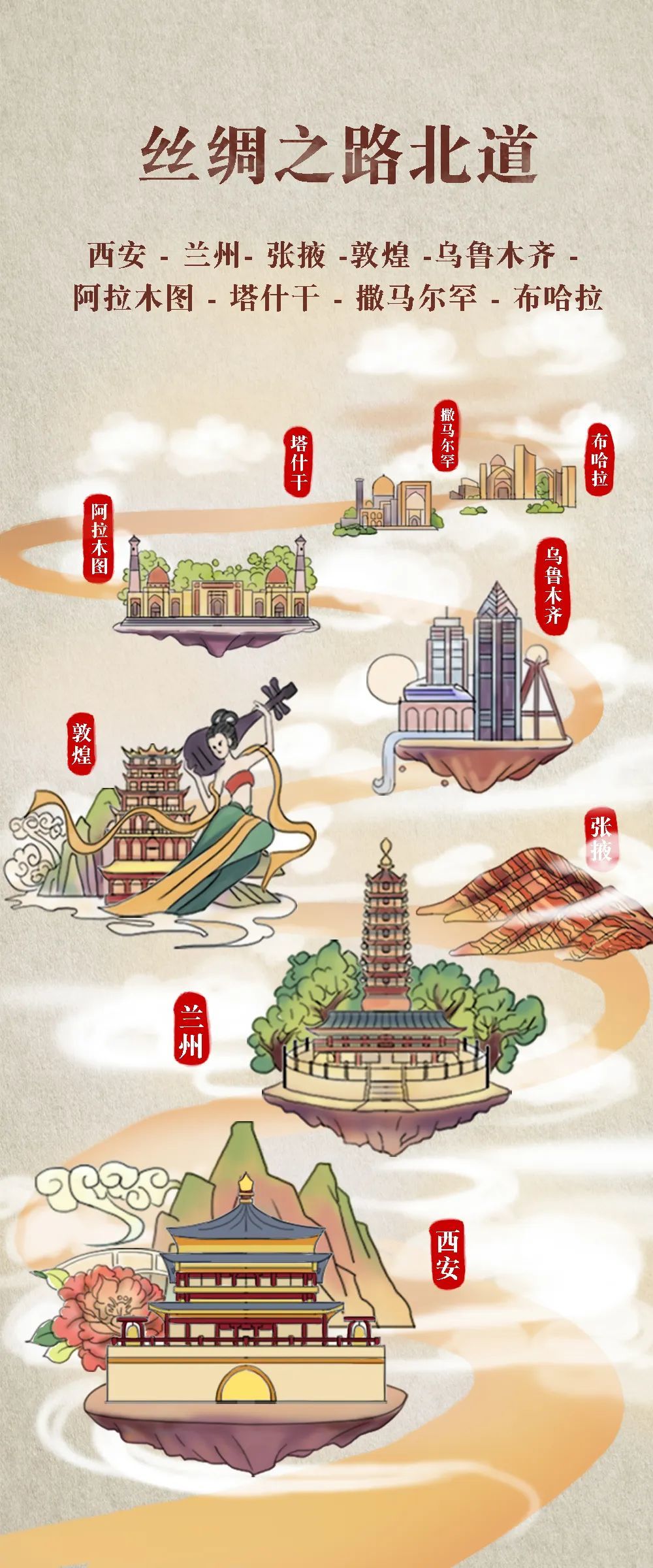 丝路之旅如今已成为旅游热门路线,人们沿着先辈足迹,感受文明的交汇与历史之变迁,窗外风景变幻,大漠的风沙吹来遥远的驼铃声……转眼间,汽车、高铁又在这片土地疾驰。