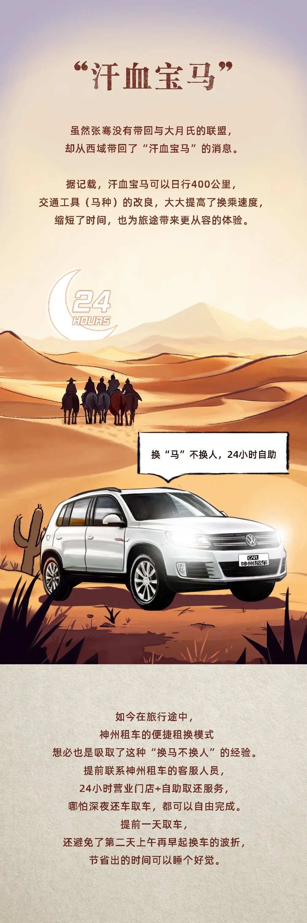 如今,“一带一路”共建国家正在史无前例进入合作与共赢的发展之路。重走丝路的半个月里,多亏了神州租车的陪伴。全力对接西部交通需求,推进千年商路互联互通。回望历史上的未央宫,大概汉武帝也未曾想到,这条路竟然能够成为串起亚欧文明的传奇之路。