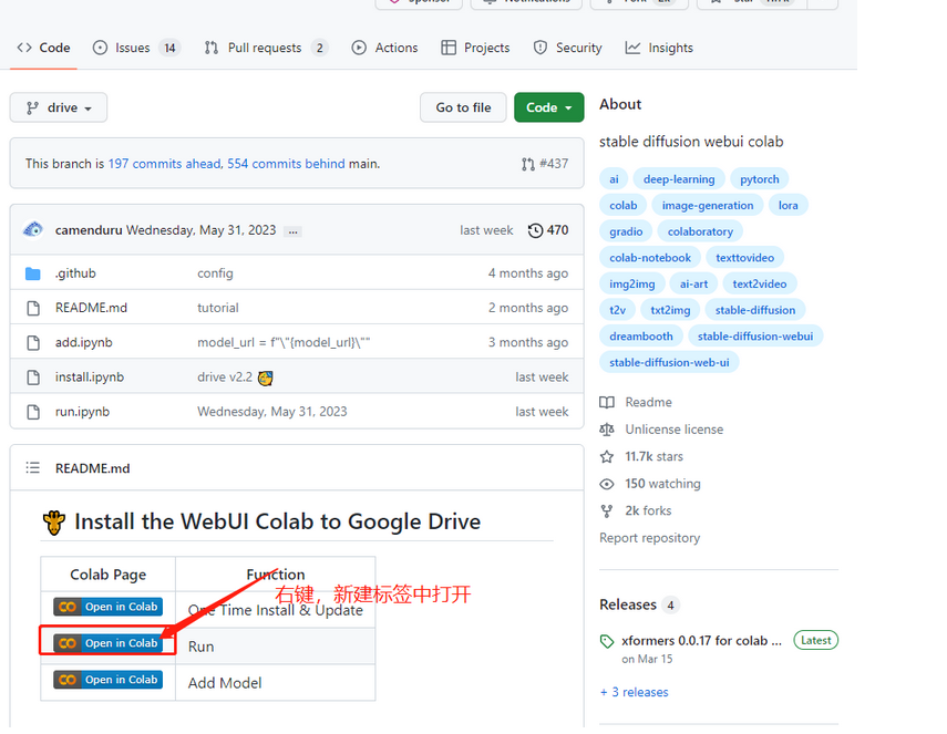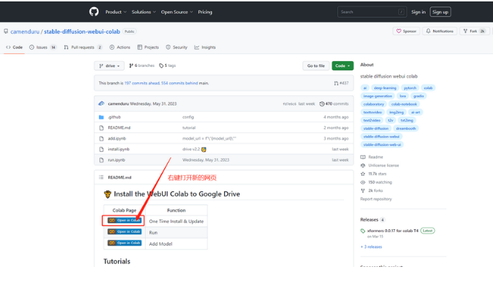 我们开始stable diffusion 的一键安装,进到我们stable Diffusion一键安装包主页,看到这个程序的说明,这里有一个表格,然后这个表格里有3个链接,我们先点击第一个,右键单击在新建标签中打开链接。