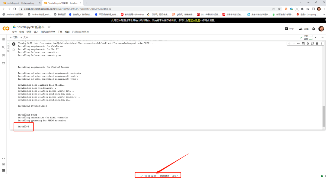 另外由于我们现在使用的是这个谷歌的免费账户,所以谷歌对我们这个资源,其实是有一定限制的,如果大家在部署过程中出现失败的情况,可能是因为咱们当下使用的(时间)节点 ,这个资源比较紧缺。我们可以尝试换一个时间,再重新部署一遍。因为这个一键安装的脚本,它本身是没有问题的。如果安装的时候出现了报错 ,那一定是谷歌服务器这边的资源出现了问题 所以我们只需要换一个时间再试一下就可以了。大家可以看到我们这一次的部署用了16分52秒,他已经把这个程序跑完了