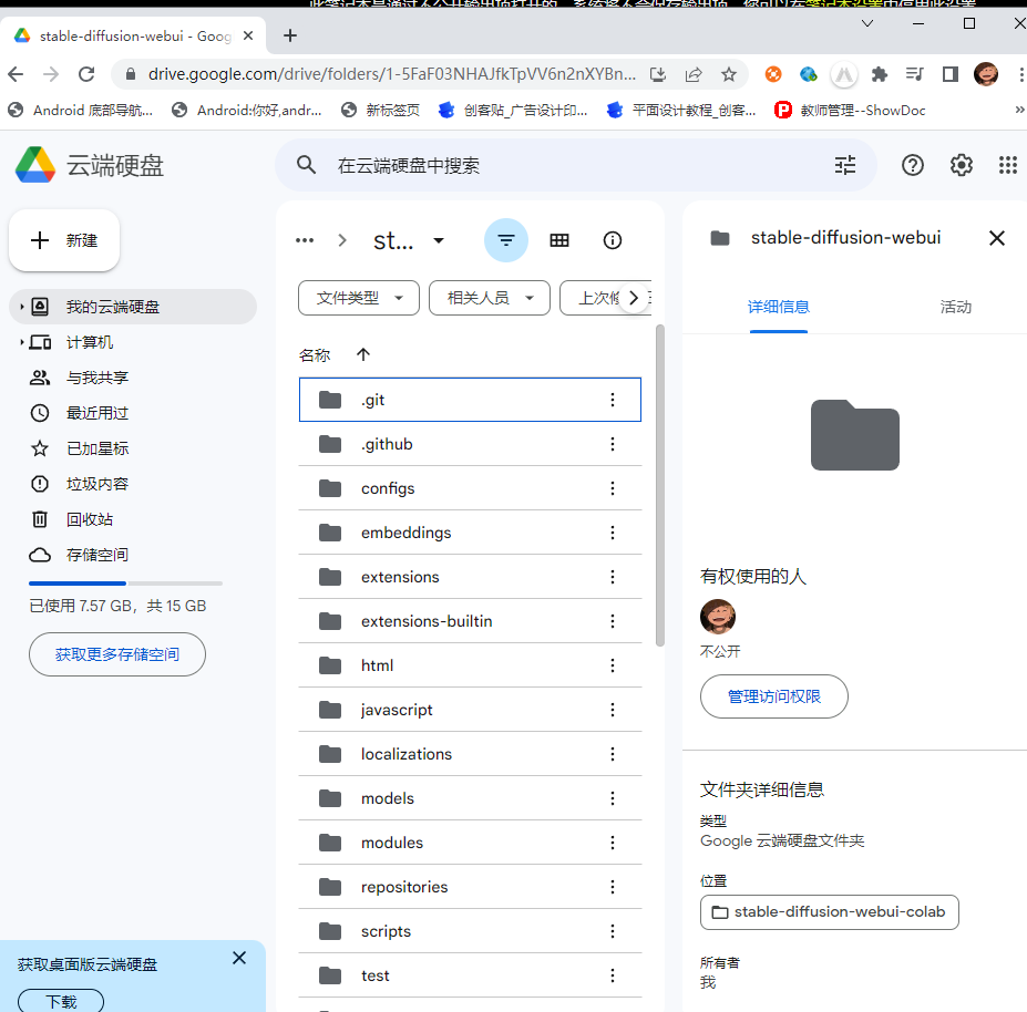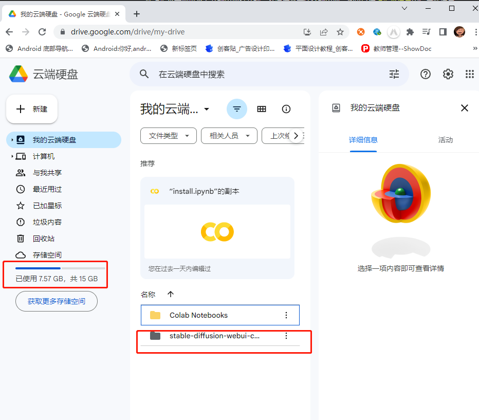 安装完成之后,大家可以看到,这个使用量已经达到了7.57 GB 然后在我们的云端硬盘里,也多出来了stable diffusion的文件夹。
