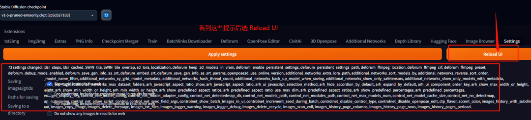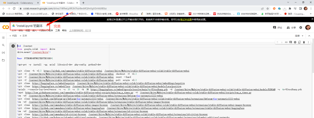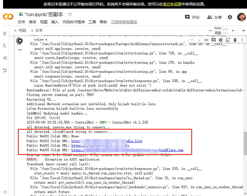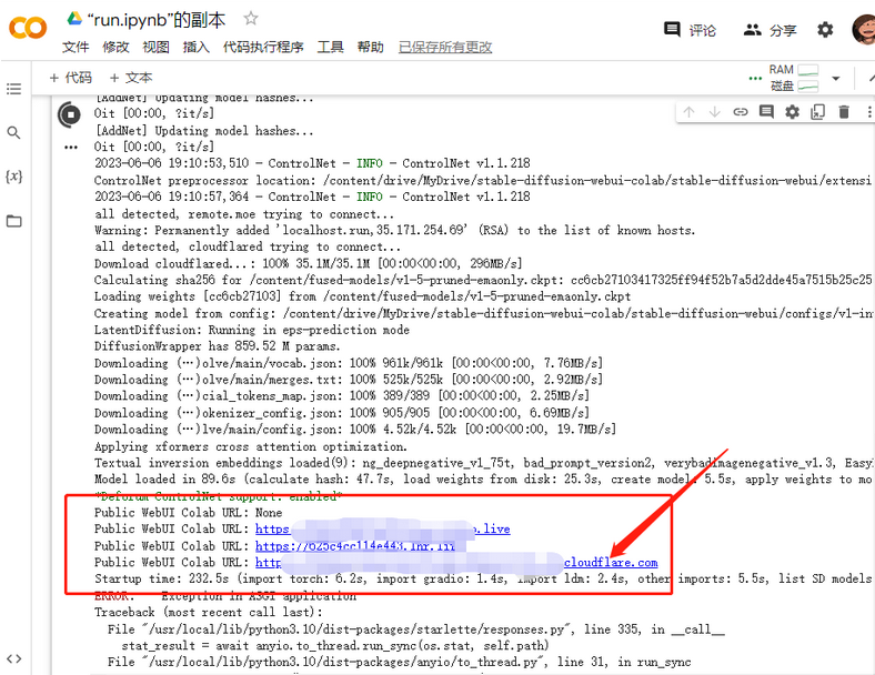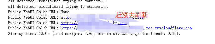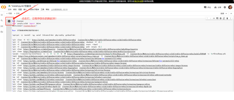 这个也需要一定的时间 我们需要等待一下,我们在等待了7分钟之后,我们终于看到了stable diffusion 访问地址。然后这里需要注意的是,虽然我们左上角这个圆圈圈还在转,但是当我们看到这个public web UI的网址之后。实际上这个程序就已经可以使用了。
