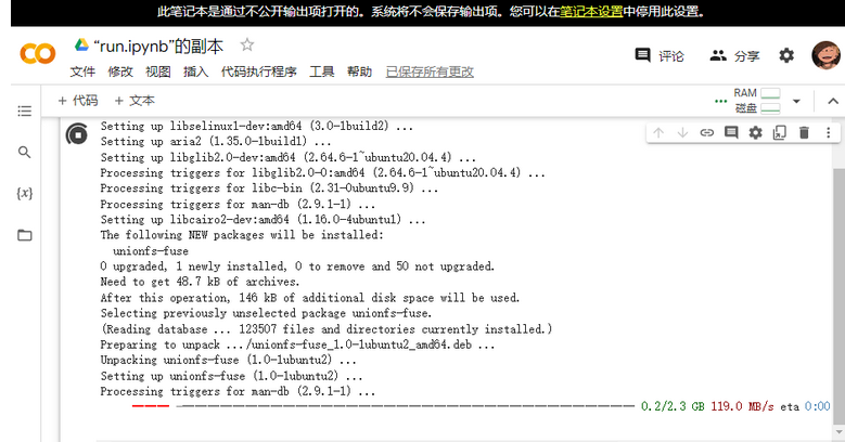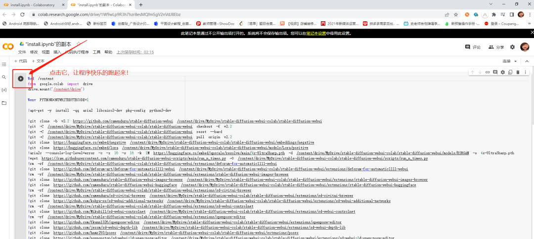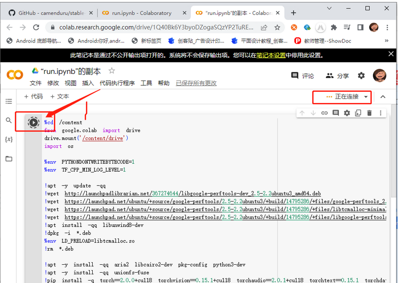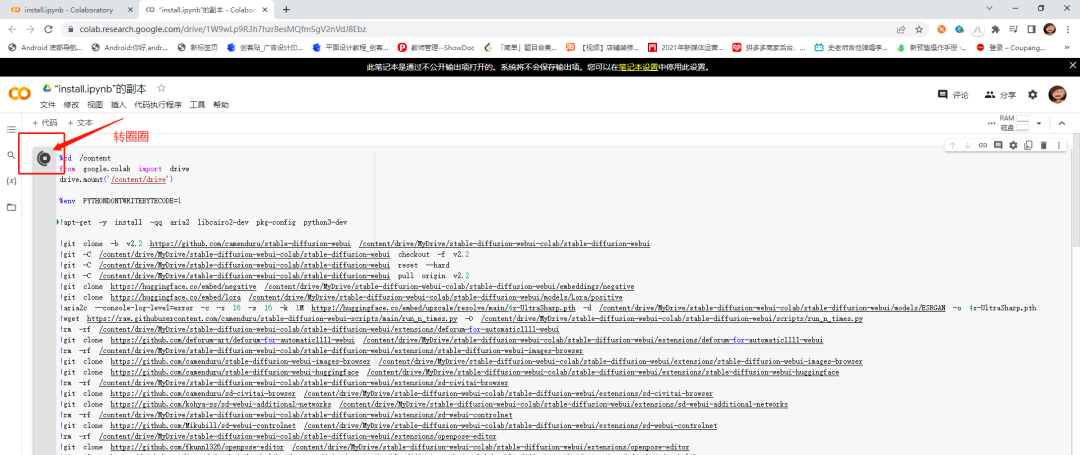 在确认这一步没有问题之后,我们还是点击这个左上角的运行按钮。我们可以看到,在右上角,这个谷歌又在为我们分配资源。