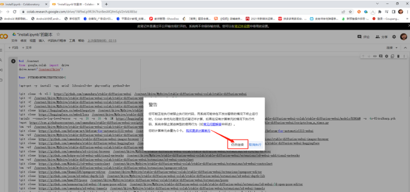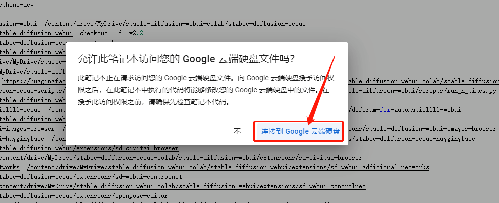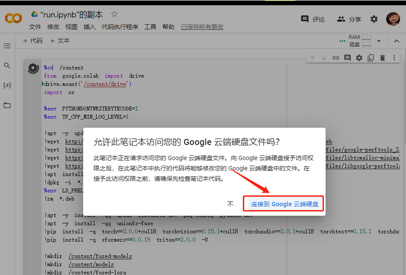 我们稍微等待一下,在资源分配完成之后,他又会弹出这个请求权限的对话框,我们还是点击连接到谷歌云端硬盘。