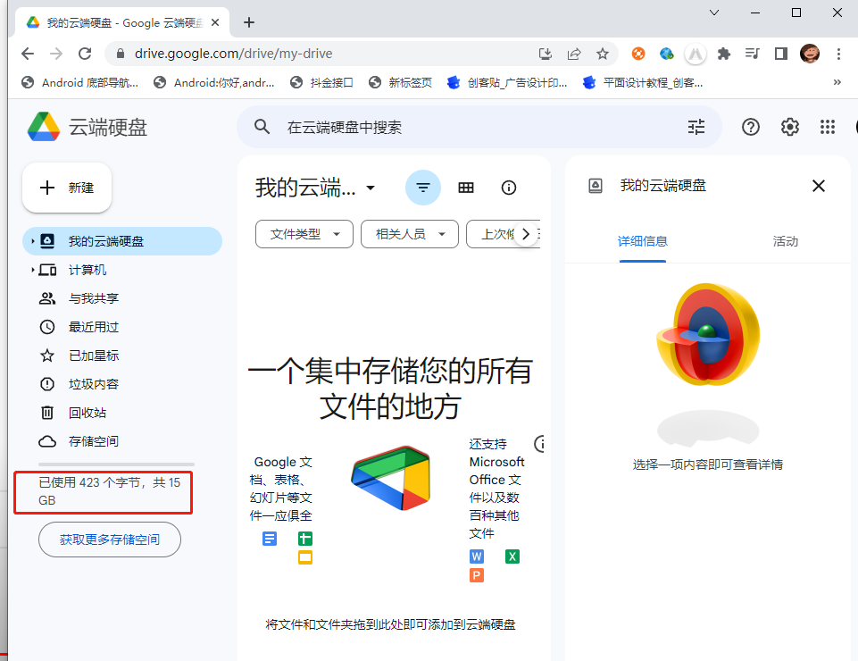 如果你是第一次进入这个云端硬盘,它会有一个欢迎的说明文件,大概在这个页面的中间位置你只需要点下一步就可以, 或者直接关掉它也可以。每一个账号谷歌会给到我们15G的使用空间,这个空间对于我们安装stable diffusion 的程序是完全够的。