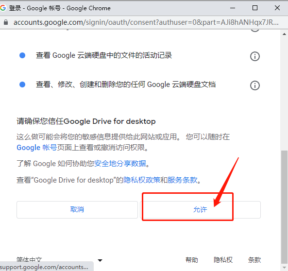 我们在等待几秒之后,谷歌会跳出一个对话框,向我们请求访问Google硬盘的权限。