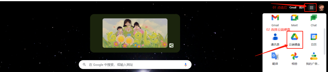 首先我们进入这个谷歌的主页,在我们头像的左边,有一个谷歌应用的按钮。我们点击一下,然后在它弹出来这个小页面中选择这个云端硬盘