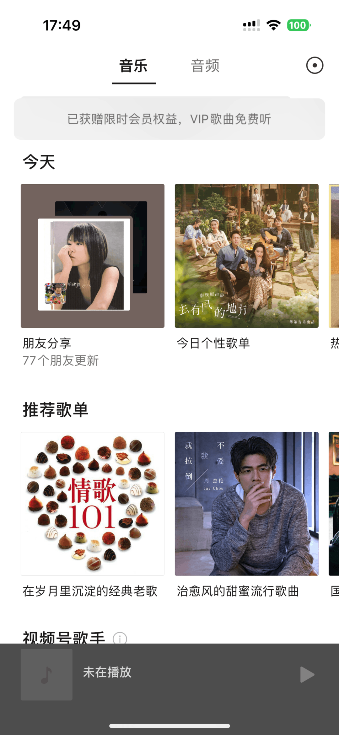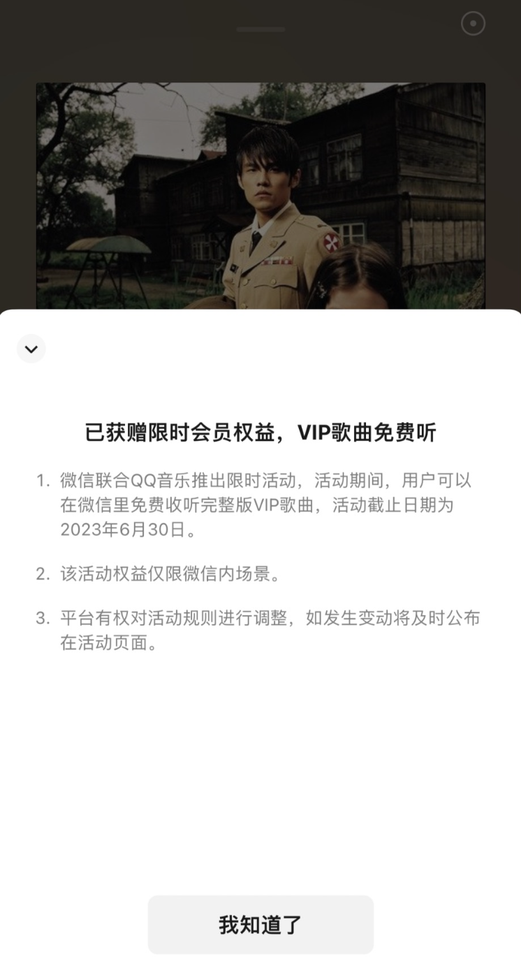 还有,通过微信音乐听歌,还能获赠会员权益,VIP歌曲免费听,限免至6月30日!